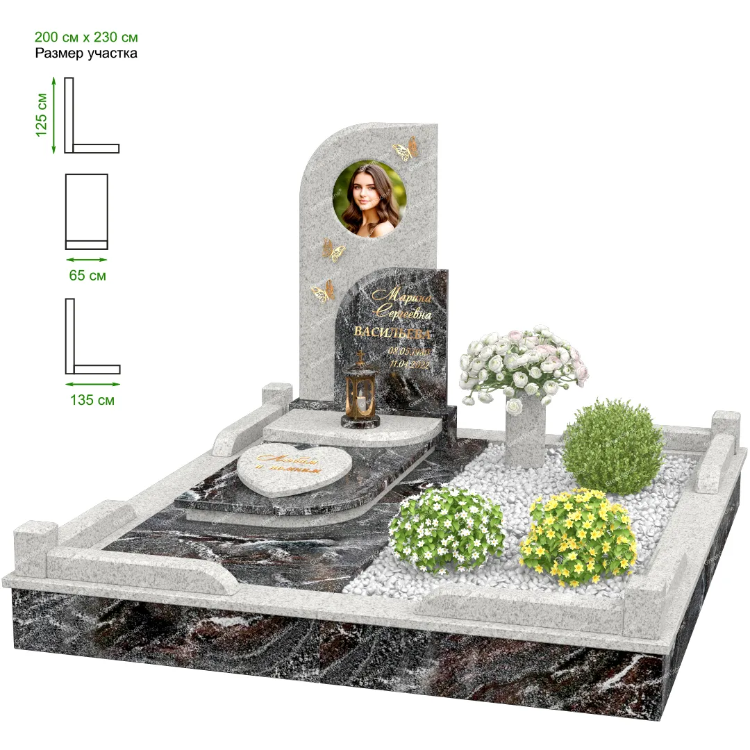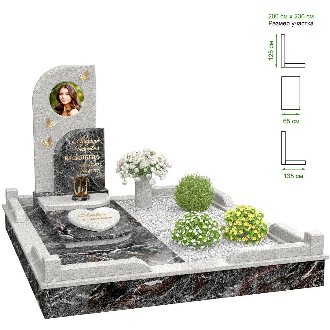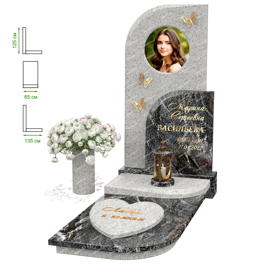 Визуально комплекс отличается от типовой формы не только формой, но и размерами. Массивная стела позволяет дизайнеру реализовать практически любые задумки и пожелания Заказчика, придать готовому изделию солидный вид, раскрыть все достоинства использованного в его изготовлении гранита. Такой габаритный памятник требует профессиональной доставки и установки. Все это также можно заказать в мастерской Грин-Стоун.