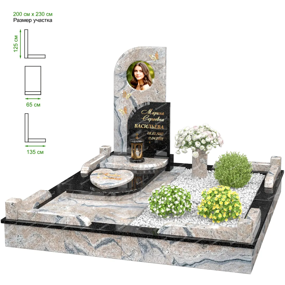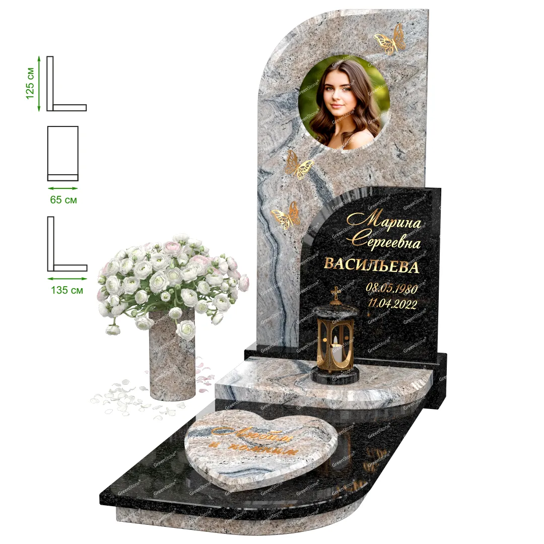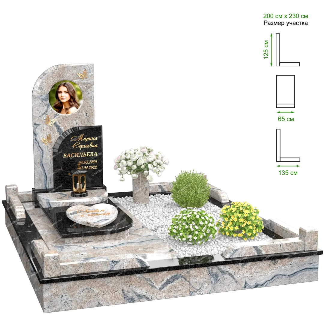 Визуально комплекс отличается от типовой формы не только формой, но и размерами. Массивная стела позволяет дизайнеру реализовать практически любые задумки и пожелания Заказчика, придать готовому изделию солидный вид, раскрыть все достоинства использованного в его изготовлении гранита. Такой габаритный памятник требует профессиональной доставки и установки. Все это также можно заказать в мастерской Грин-Стоун.