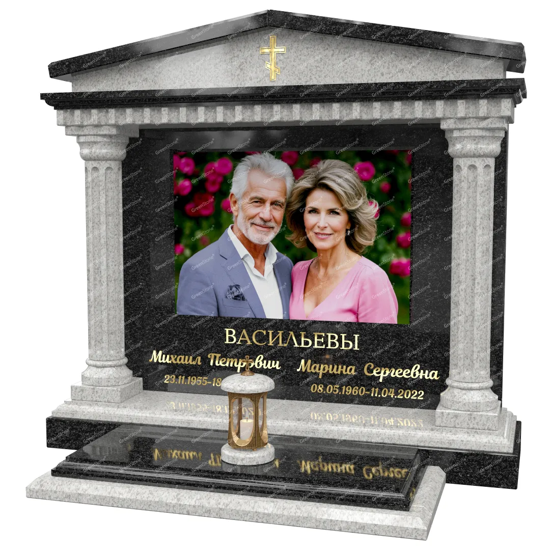 Визуально комплекс отличается от типовой формы не только формой, но и размерами. Массивная стела позволяет дизайнеру реализовать практически любые задумки и пожелания Заказчика, придать готовому изделию солидный вид, раскрыть все достоинства использованного в его изготовлении гранита. Такой габаритный памятник требует профессиональной доставки и установки. Все это также можно заказать в мастерской Грин-Стоун.