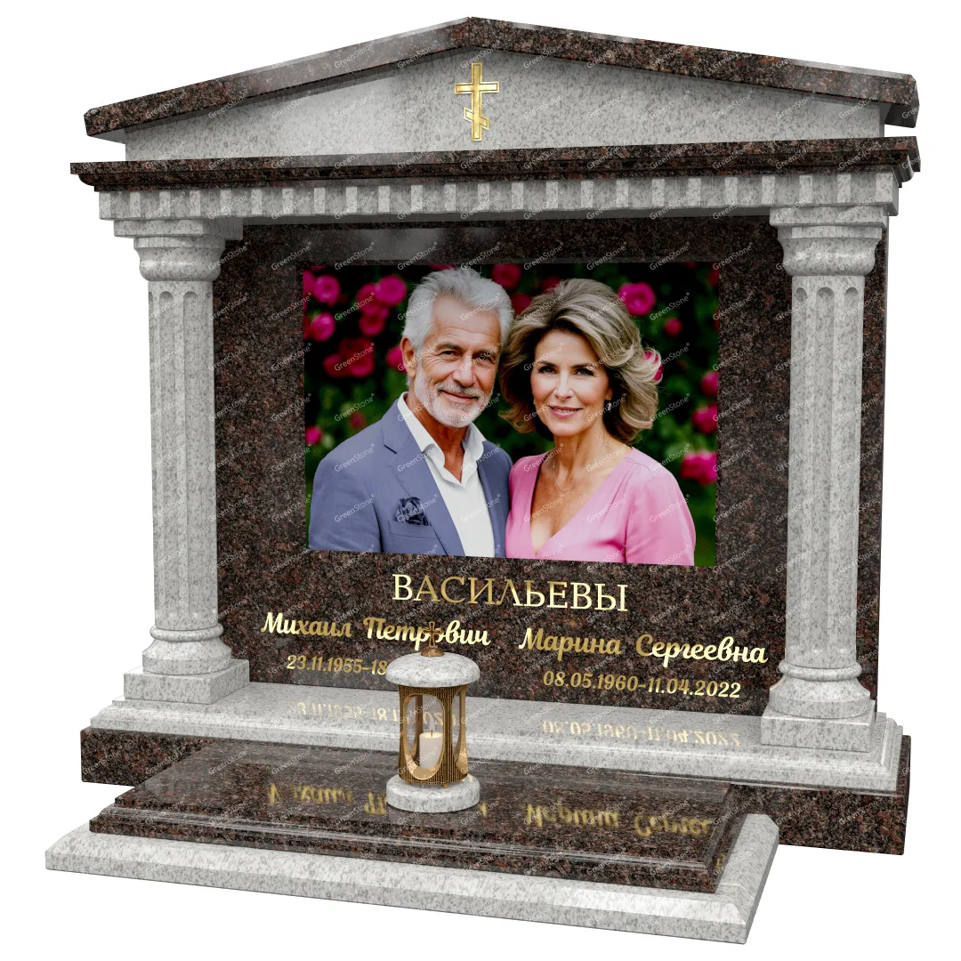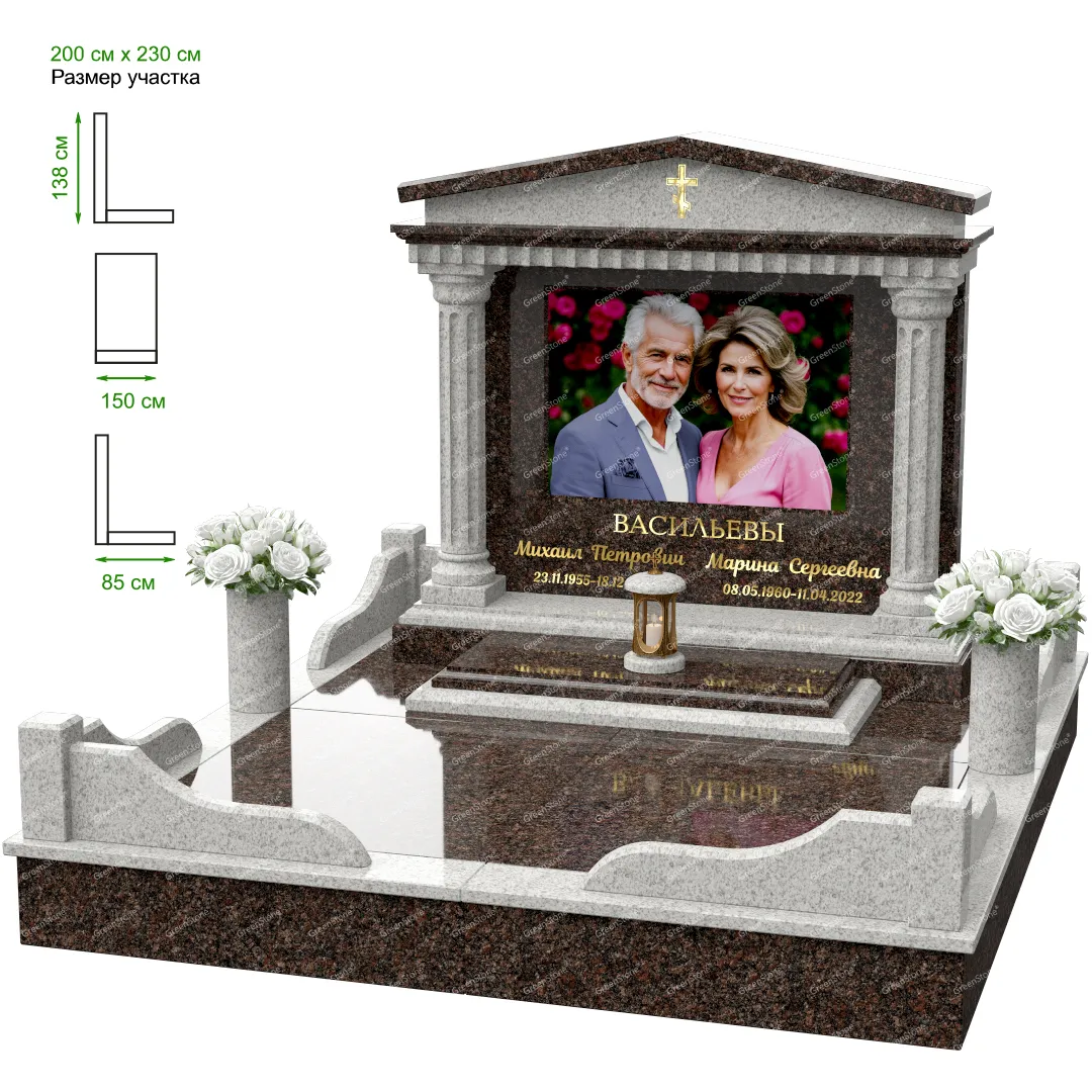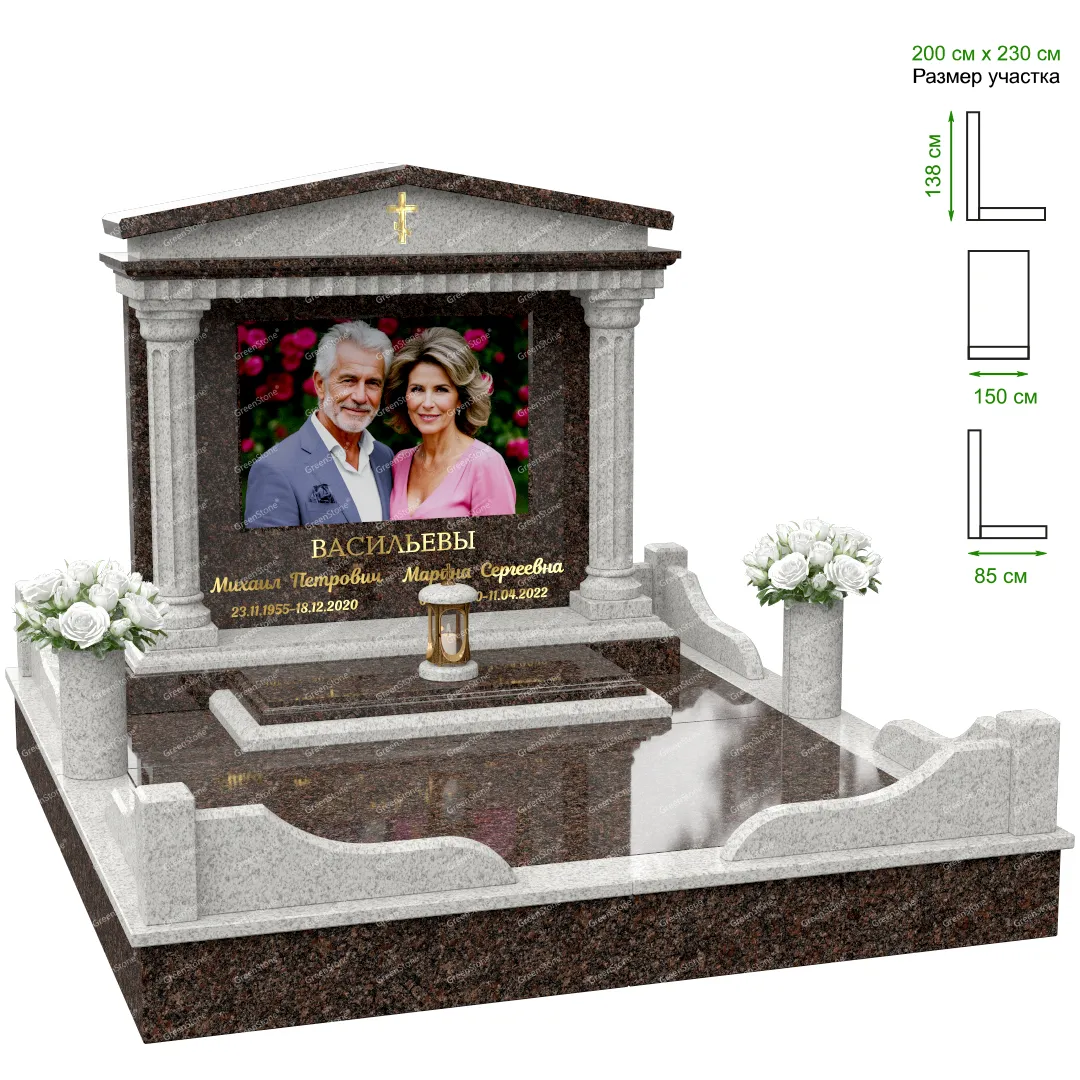 Визуально комплекс отличается от типовой формы не только формой, но и размерами. Массивная стела позволяет дизайнеру реализовать практически любые задумки и пожелания Заказчика, придать готовому изделию солидный вид, раскрыть все достоинства использованного в его изготовлении гранита. Такой габаритный памятник требует профессиональной доставки и установки. Все это также можно заказать в мастерской Грин-Стоун.