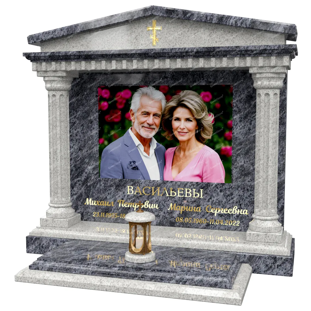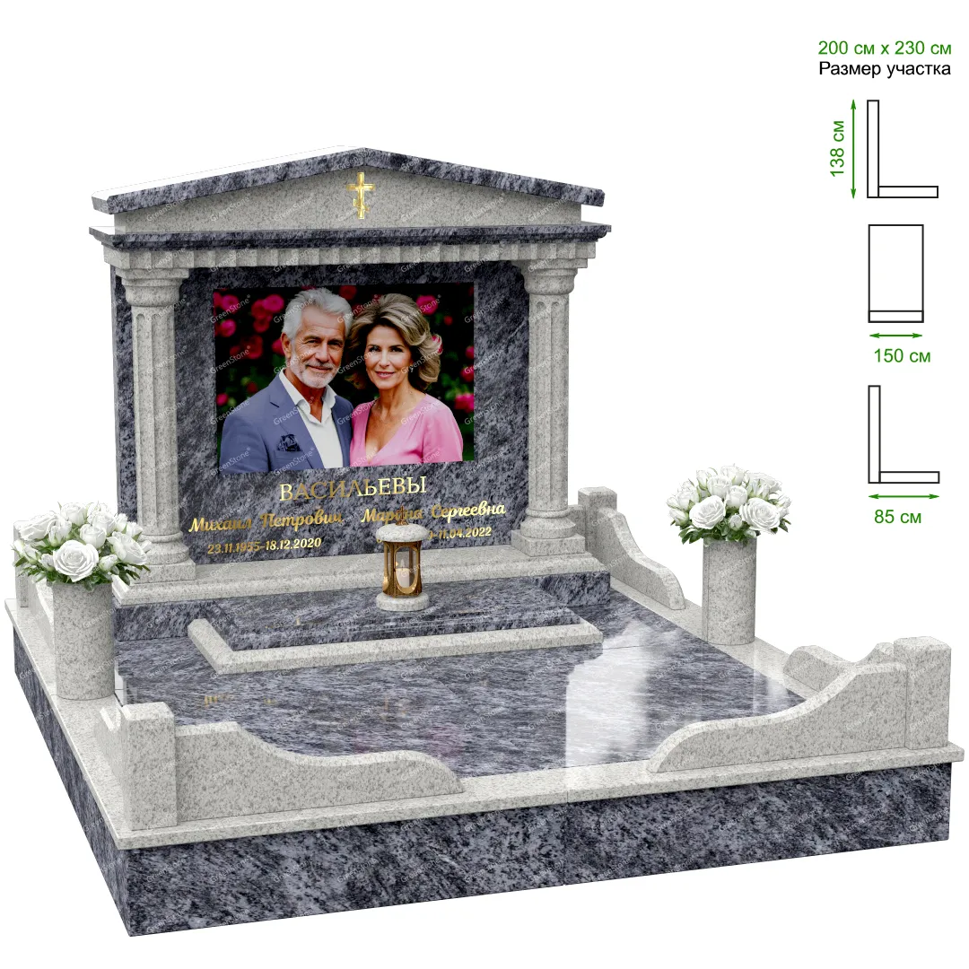 Визуально комплекс отличается от типовой формы не только формой, но и размерами. Массивная стела позволяет дизайнеру реализовать практически любые задумки и пожелания Заказчика, придать готовому изделию солидный вид, раскрыть все достоинства использованного в его изготовлении гранита. Такой габаритный памятник требует профессиональной доставки и установки. Все это также можно заказать в мастерской Грин-Стоун.