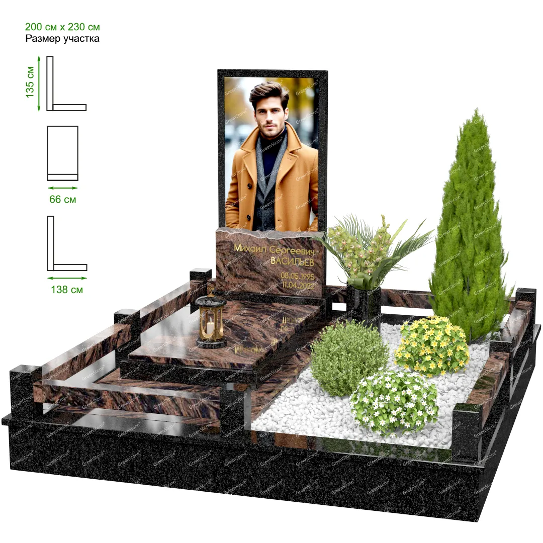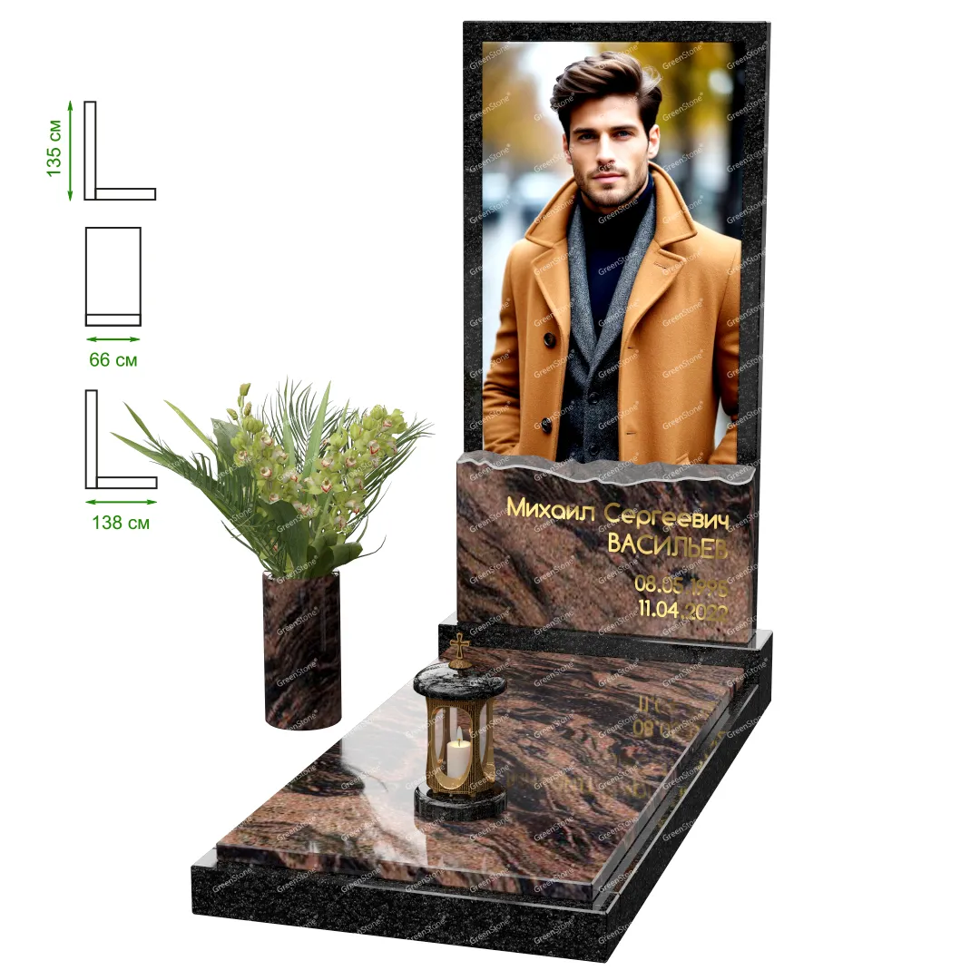 Визуально комплекс отличается от типовой формы не только формой, но и размерами. Массивная стела позволяет дизайнеру реализовать практически любые задумки и пожелания Заказчика, придать готовому изделию солидный вид, раскрыть все достоинства использованного в его изготовлении гранита. Такой габаритный памятник требует профессиональной доставки и установки. Все это также можно заказать в мастерской Грин-Стоун.
