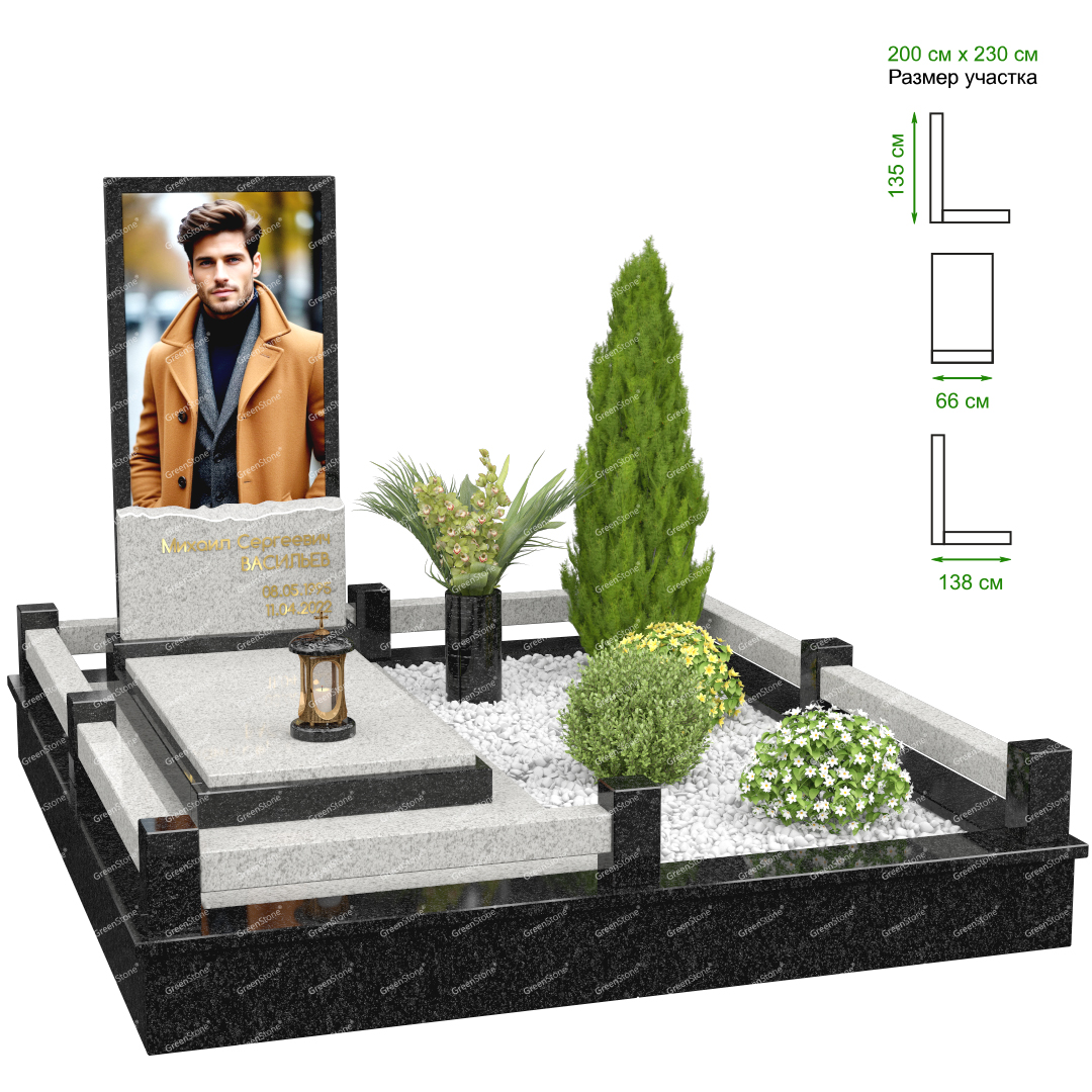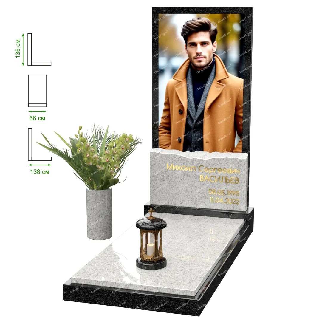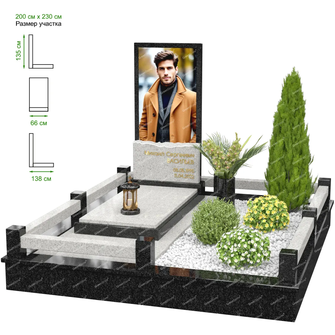 Визуально комплекс отличается от типовой формы не только формой, но и размерами. Массивная стела позволяет дизайнеру реализовать практически любые задумки и пожелания Заказчика, придать готовому изделию солидный вид, раскрыть все достоинства использованного в его изготовлении гранита. Такой габаритный памятник требует профессиональной доставки и установки. Все это также можно заказать в мастерской Грин-Стоун.