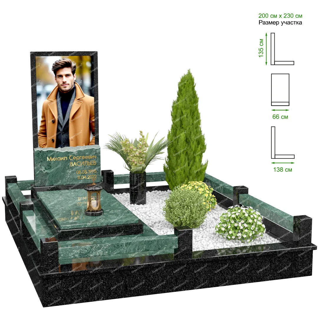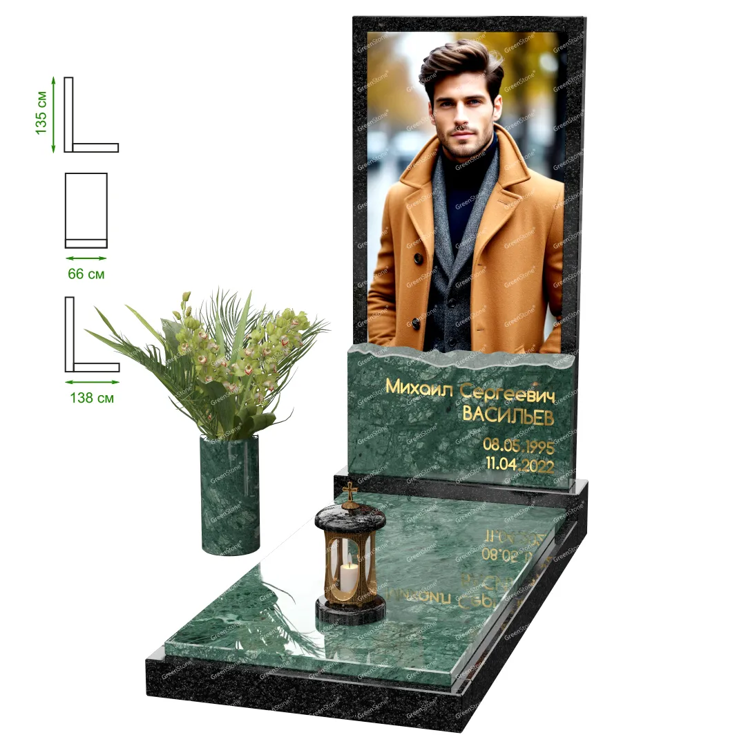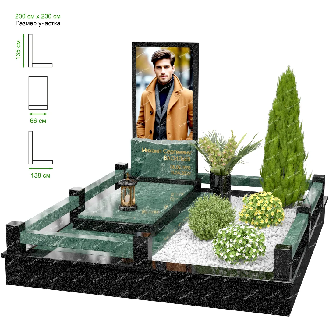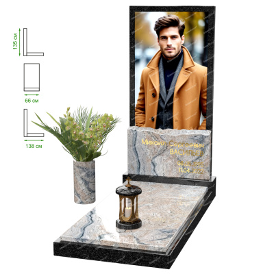 Визуально комплекс отличается от типовой формы не только формой, но и размерами. Массивная стела позволяет дизайнеру реализовать практически любые задумки и пожелания Заказчика, придать готовому изделию солидный вид, раскрыть все достоинства использованного в его изготовлении гранита. Такой габаритный памятник требует профессиональной доставки и установки. Все это также можно заказать в мастерской Грин-Стоун.