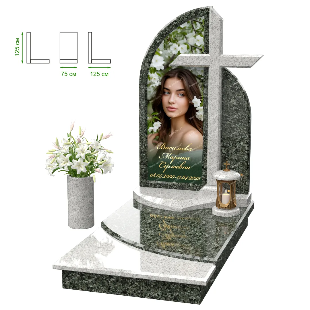 Визуально комплекс отличается от типовой формы не только формой, но и размерами. Массивная стела позволяет дизайнеру реализовать практически любые задумки и пожелания Заказчика, придать готовому изделию солидный вид, раскрыть все достоинства использованного в его изготовлении гранита. Такой габаритный памятник требует профессиональной доставки и установки. Все это также можно заказать в мастерской Грин-Стоун.