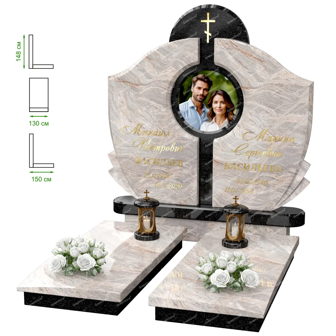 Визуально комплекс отличается от типовой формы не только формой, но и размерами. Массивная стела позволяет дизайнеру реализовать практически любые задумки и пожелания Заказчика, придать готовому изделию солидный вид, раскрыть все достоинства использованного в его изготовлении гранита. Такой габаритный памятник требует профессиональной доставки и установки. Все это также можно заказать в мастерской Грин-Стоун.