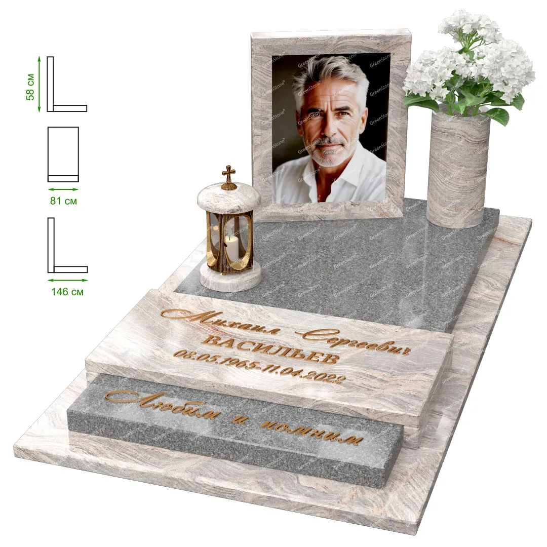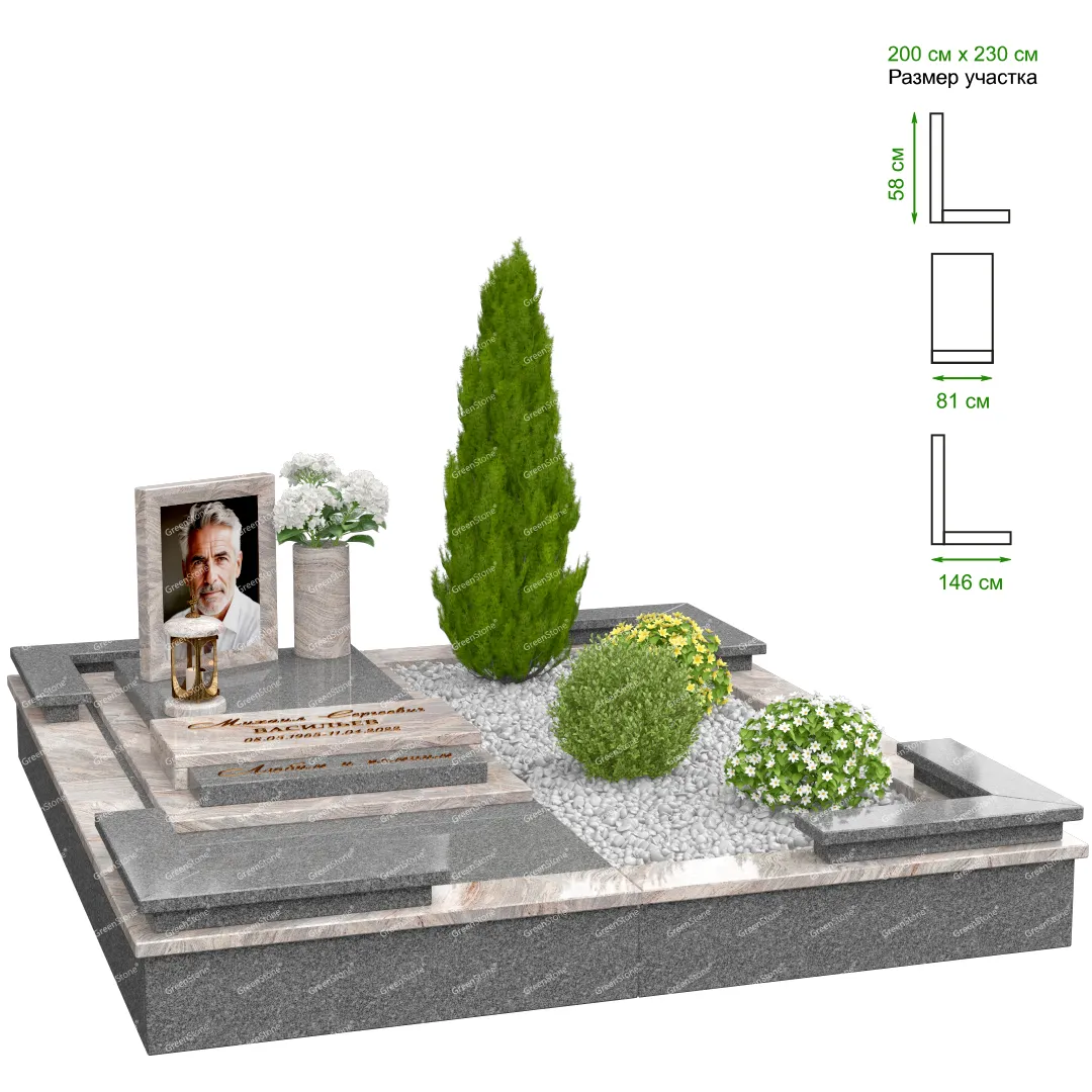 Визуально комплекс отличается от типовой формы не только формой, но и размерами. Массивная стела позволяет дизайнеру реализовать практически любые задумки и пожелания Заказчика, придать готовому изделию солидный вид, раскрыть все достоинства использованного в его изготовлении гранита. Такой габаритный памятник требует профессиональной доставки и установки. Все это также можно заказать в мастерской Грин-Стоун.