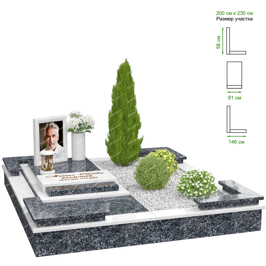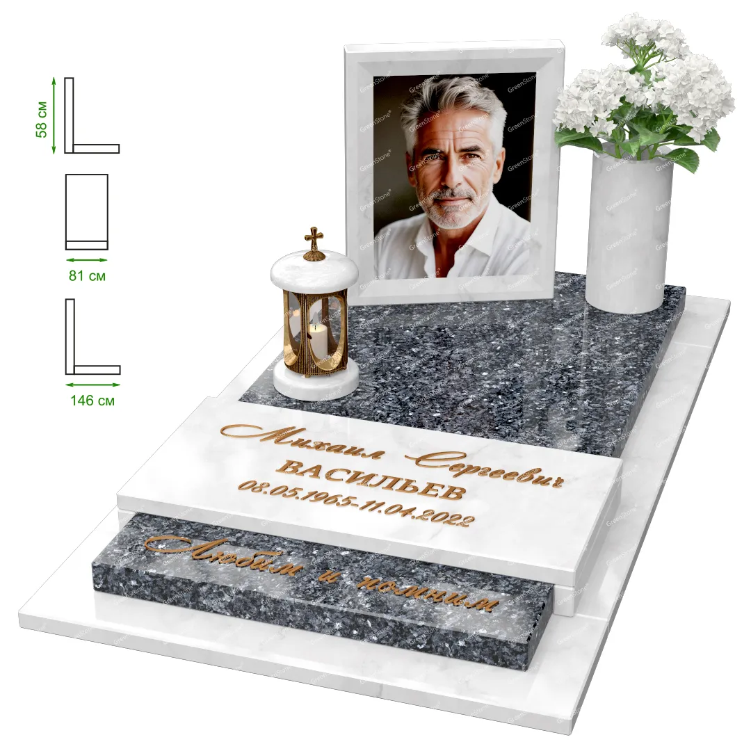 Визуально комплекс отличается от типовой формы не только формой, но и размерами. Массивная стела позволяет дизайнеру реализовать практически любые задумки и пожелания Заказчика, придать готовому изделию солидный вид, раскрыть все достоинства использованного в его изготовлении гранита. Такой габаритный памятник требует профессиональной доставки и установки. Все это также можно заказать в мастерской Грин-Стоун.