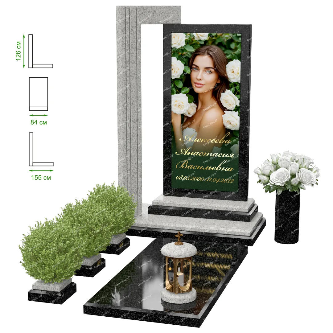Визуально комплекс отличается от типовой формы не только формой, но и размерами. Массивная стела позволяет дизайнеру реализовать практически любые задумки и пожелания Заказчика, придать готовому изделию солидный вид, раскрыть все достоинства использованного в его изготовлении гранита. Такой габаритный памятник требует профессиональной доставки и установки. Все это также можно заказать в мастерской Грин-Стоун.