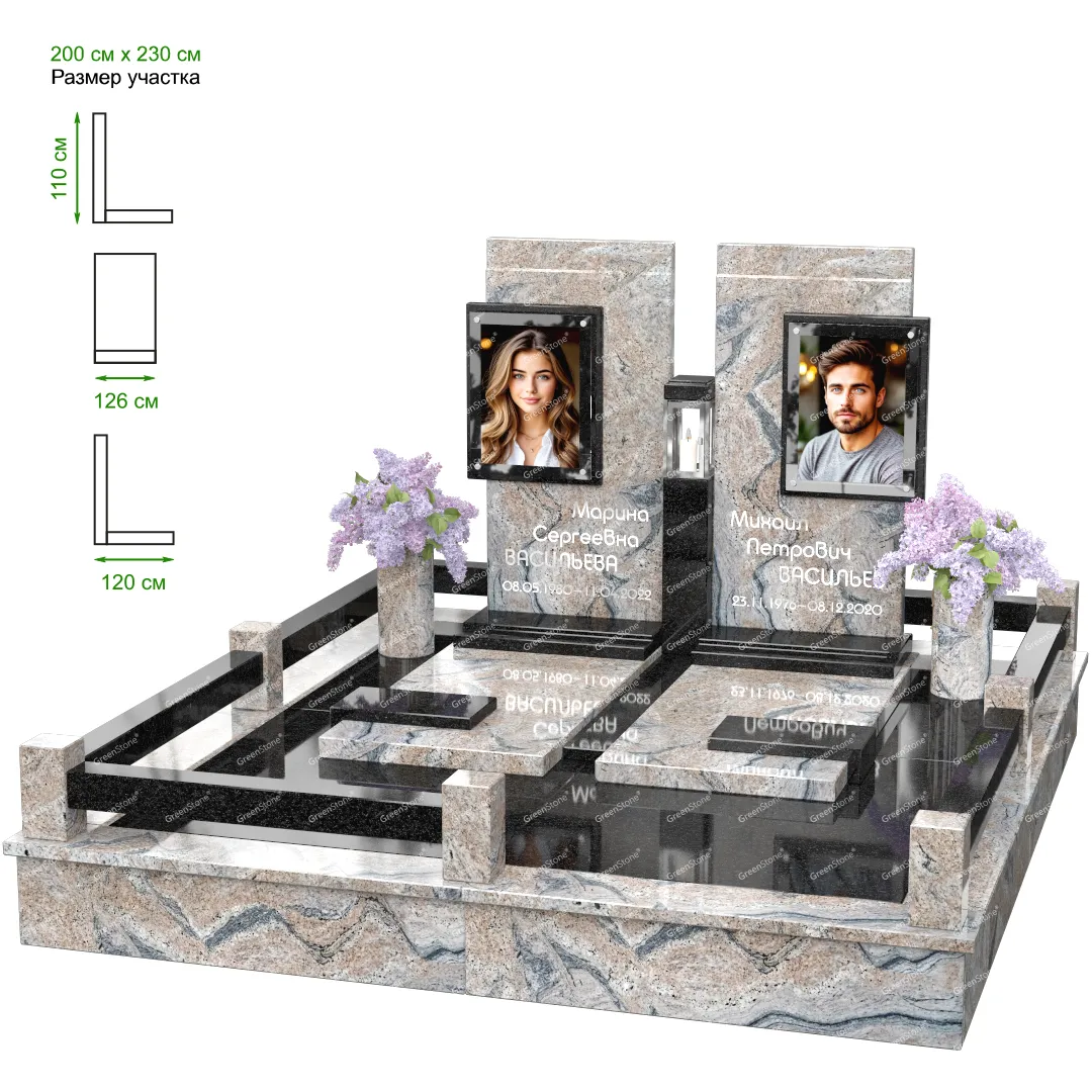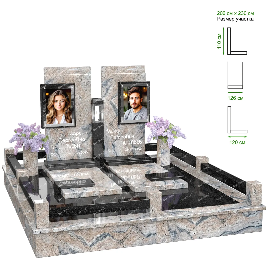 Визуально комплекс отличается от типовой формы не только формой, но и размерами. Массивная стела позволяет дизайнеру реализовать практически любые задумки и пожелания Заказчика, придать готовому изделию солидный вид, раскрыть все достоинства использованного в его изготовлении гранита. Такой габаритный памятник требует профессиональной доставки и установки. Все это также можно заказать в мастерской Грин-Стоун.