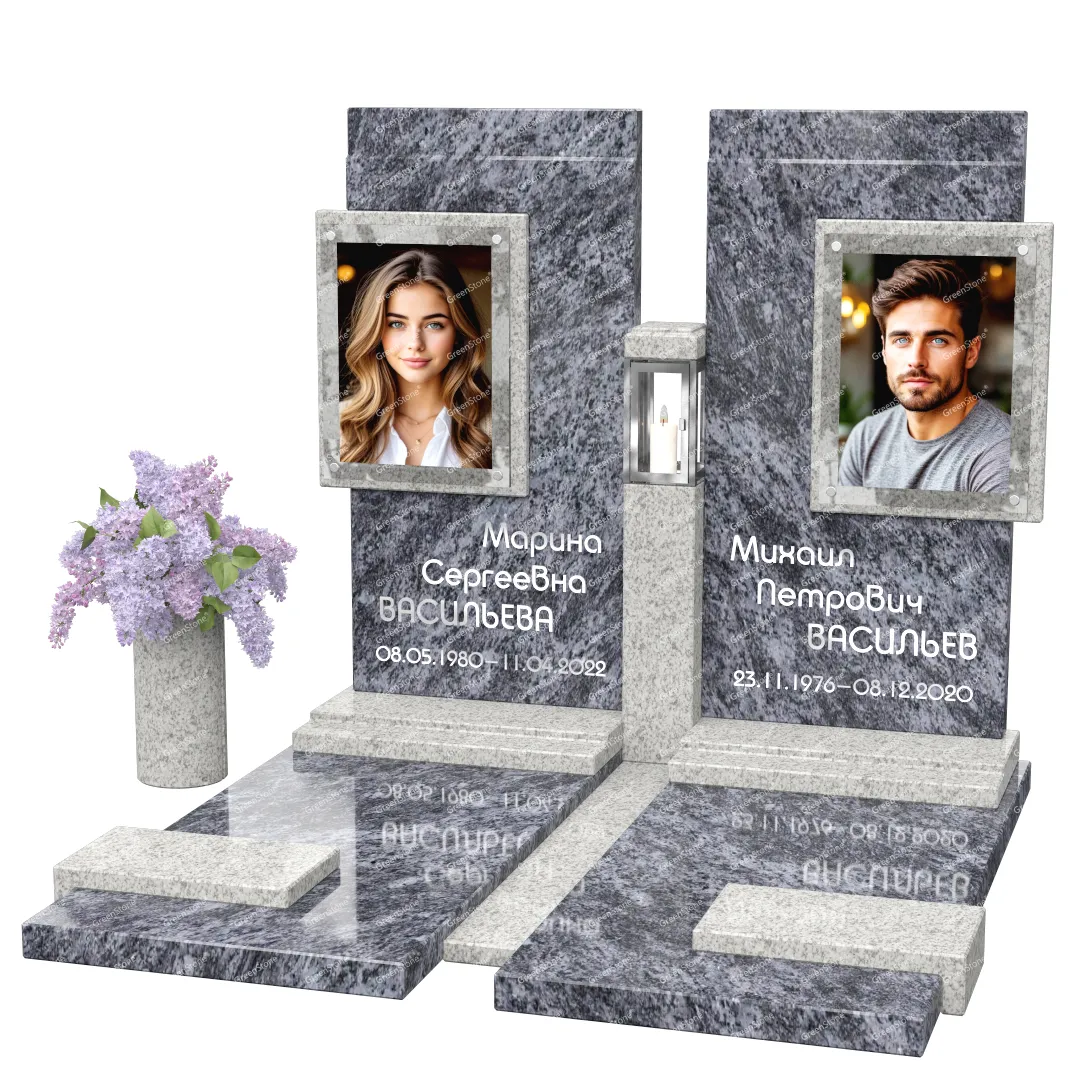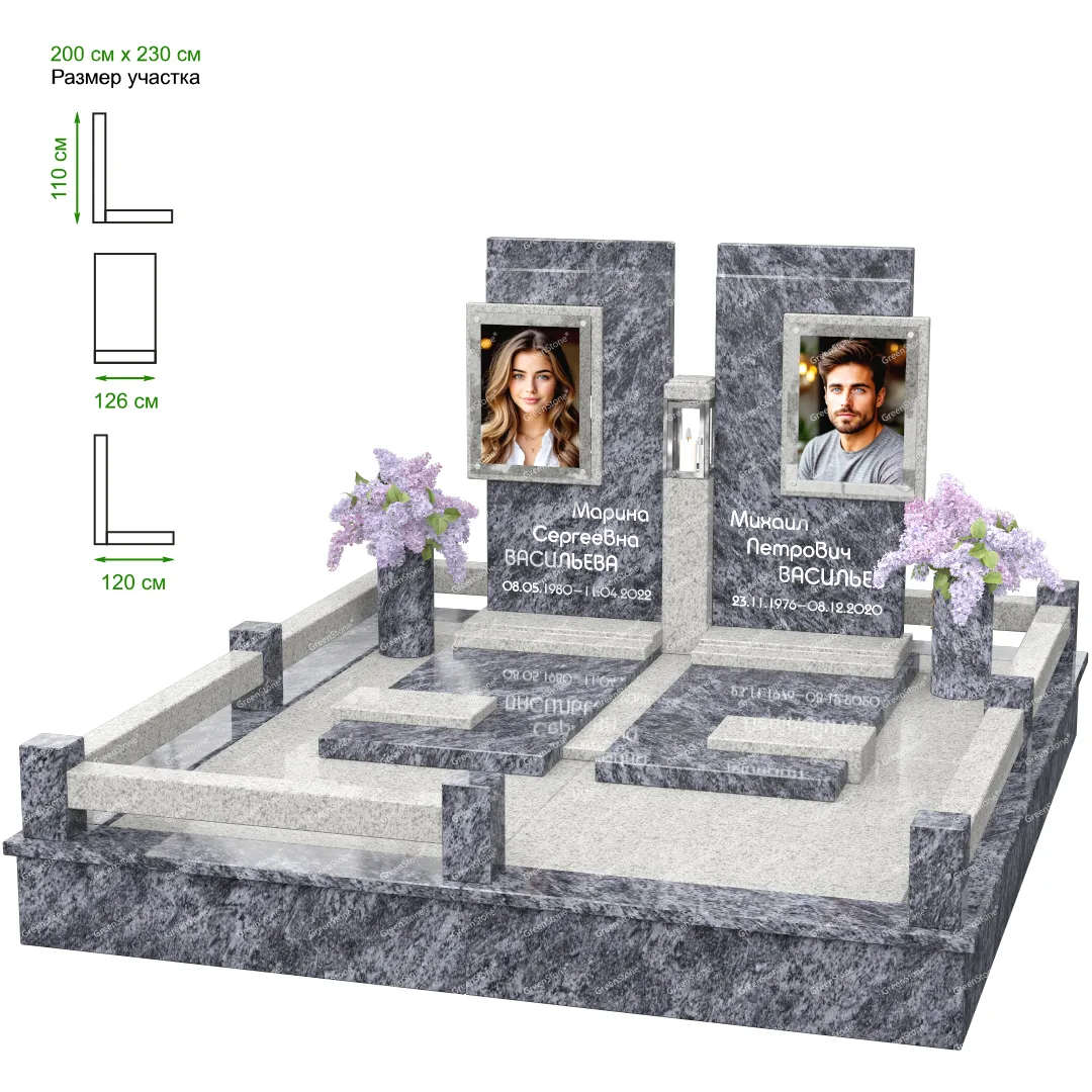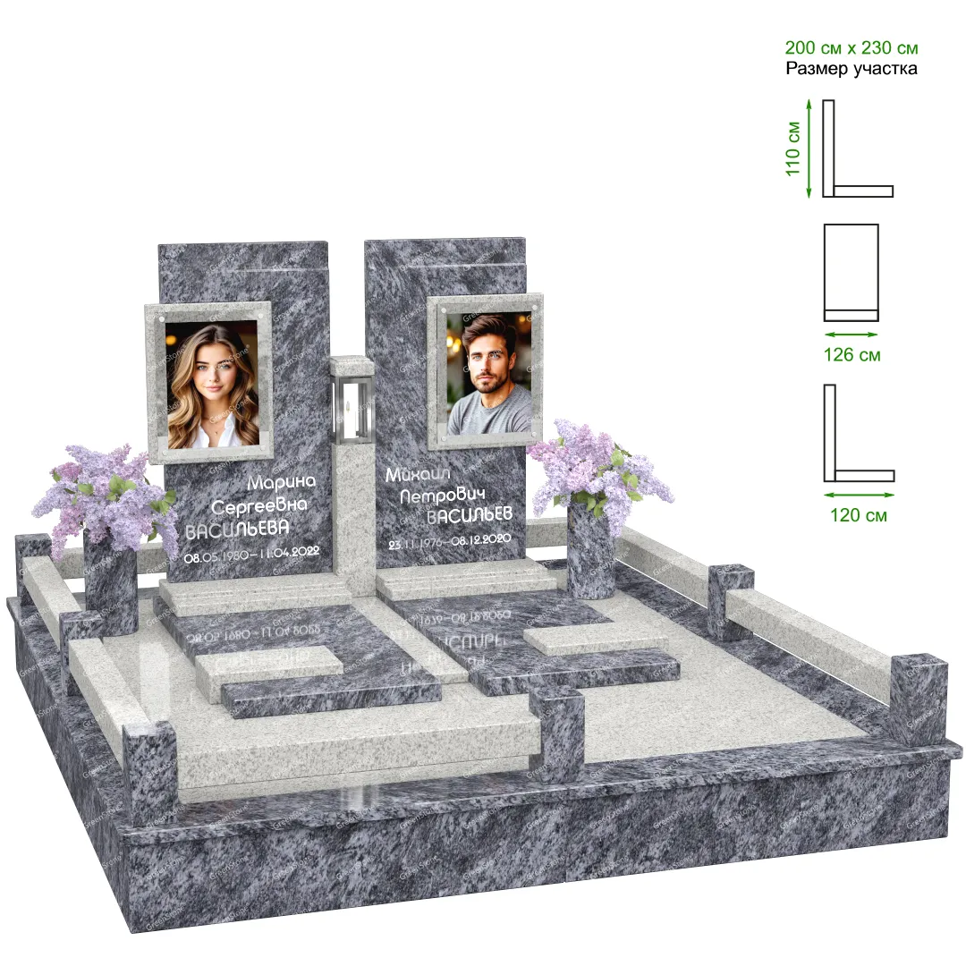 Визуально комплекс отличается от типовой формы не только формой, но и размерами. Массивная стела позволяет дизайнеру реализовать практически любые задумки и пожелания Заказчика, придать готовому изделию солидный вид, раскрыть все достоинства использованного в его изготовлении гранита. Такой габаритный памятник требует профессиональной доставки и установки. Все это также можно заказать в мастерской Грин-Стоун.