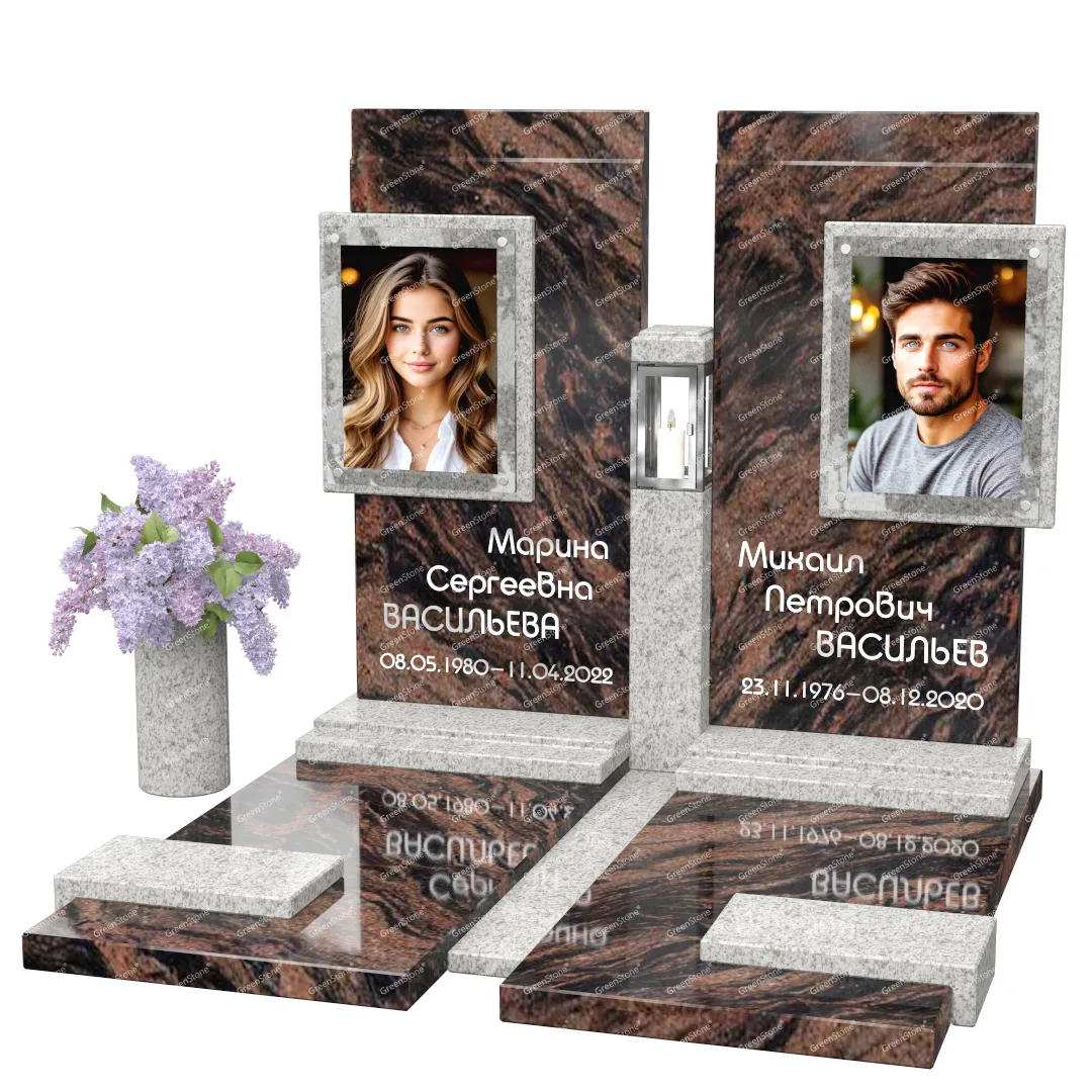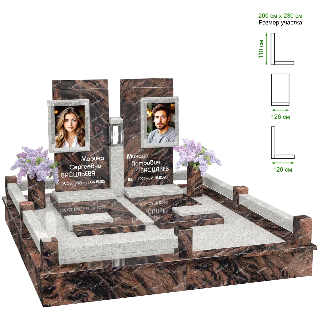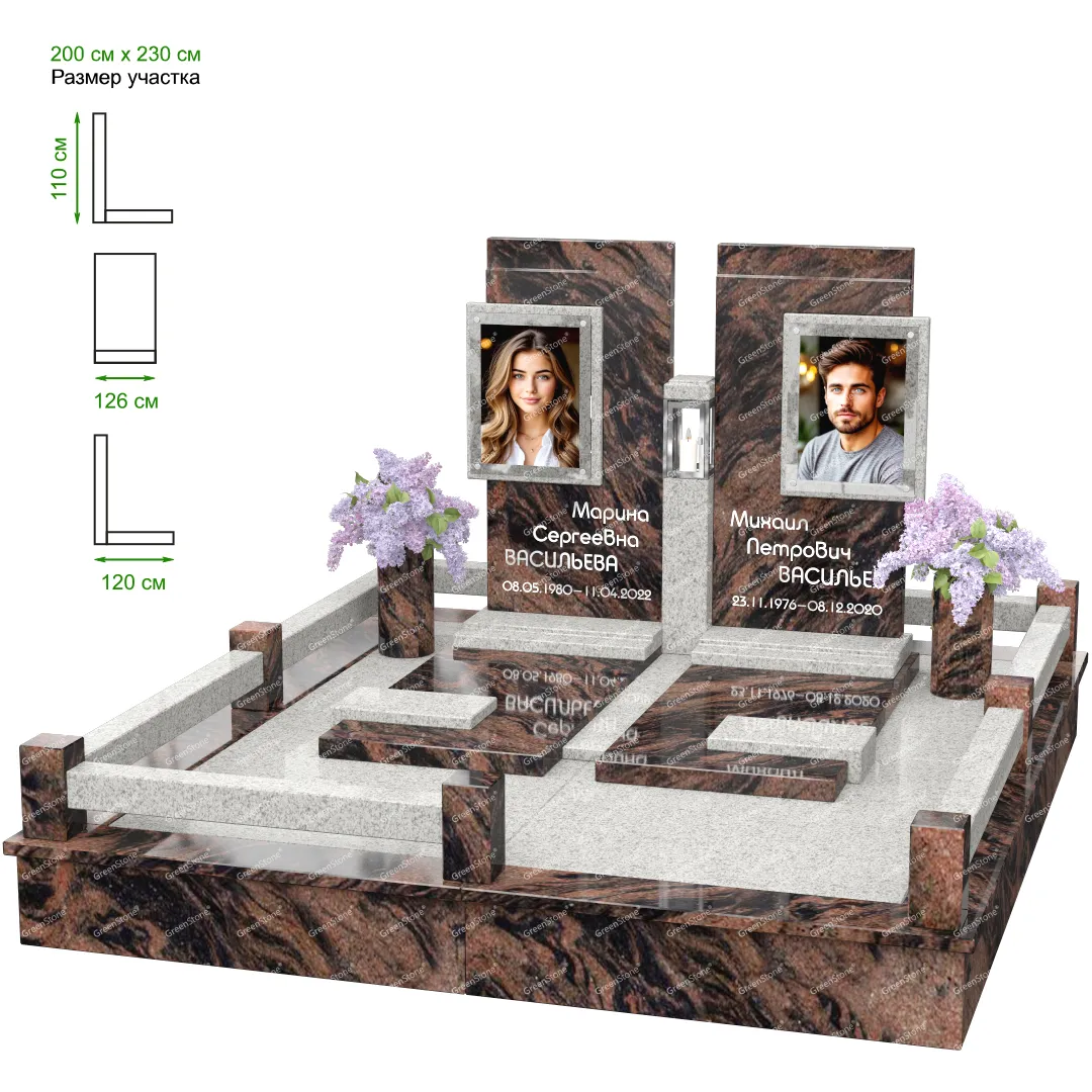 Визуально комплекс отличается от типовой формы не только формой, но и размерами. Массивная стела позволяет дизайнеру реализовать практически любые задумки и пожелания Заказчика, придать готовому изделию солидный вид, раскрыть все достоинства использованного в его изготовлении гранита. Такой габаритный памятник требует профессиональной доставки и установки. Все это также можно заказать в мастерской Грин-Стоун.