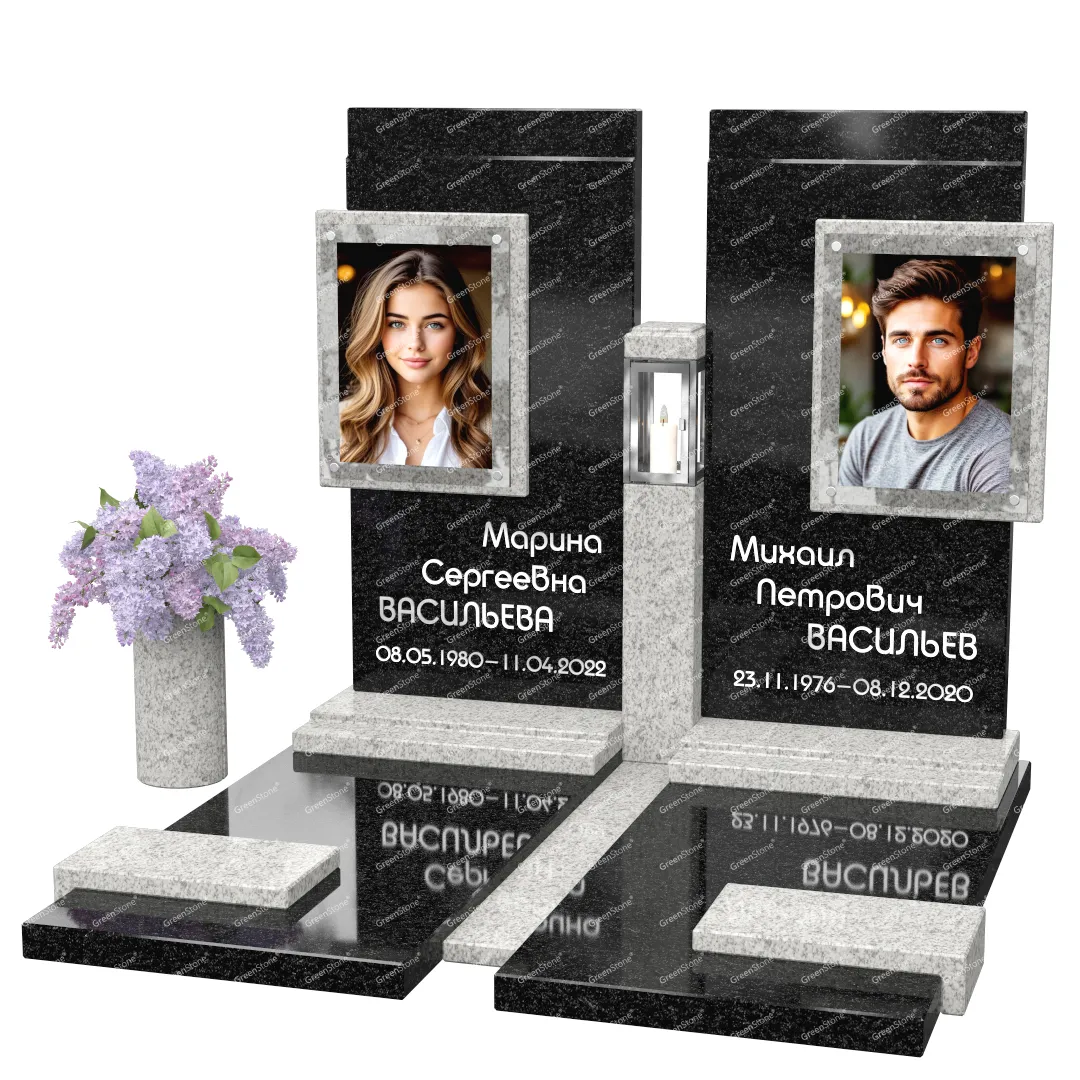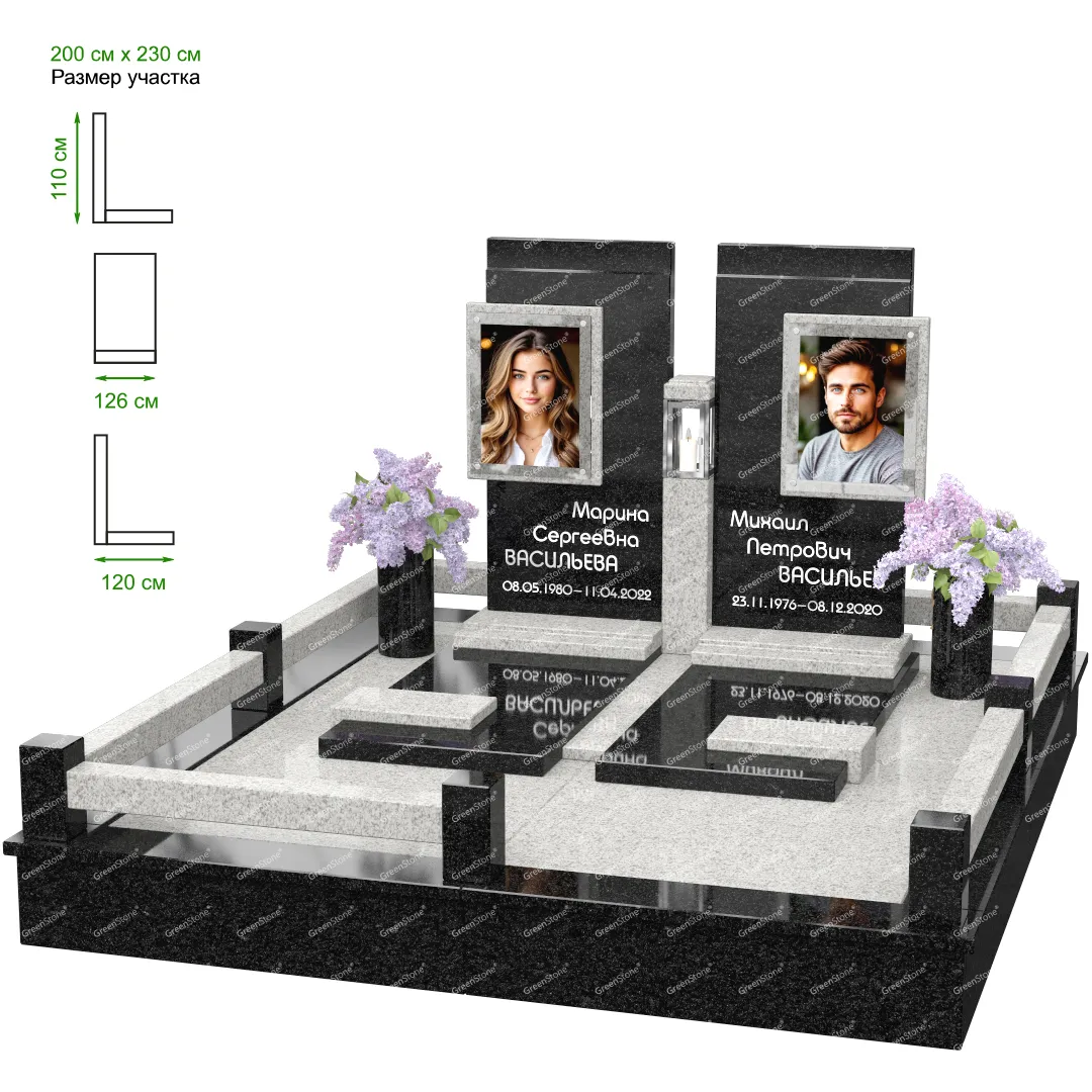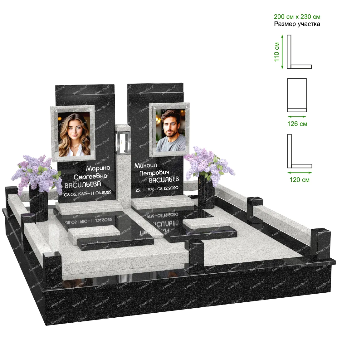 Визуально комплекс отличается от типовой формы не только формой, но и размерами. Массивная стела позволяет дизайнеру реализовать практически любые задумки и пожелания Заказчика, придать готовому изделию солидный вид, раскрыть все достоинства использованного в его изготовлении гранита. Такой габаритный памятник требует профессиональной доставки и установки. Все это также можно заказать в мастерской Грин-Стоун.