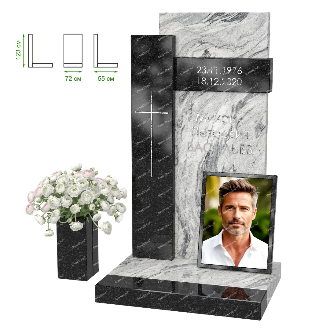 Визуально комплекс отличается от типовой формы не только формой, но и размерами. Массивная стела позволяет дизайнеру реализовать практически любые задумки и пожелания Заказчика, придать готовому изделию солидный вид, раскрыть все достоинства использованного в его изготовлении гранита. Такой габаритный памятник требует профессиональной доставки и установки. Все это также можно заказать в мастерской Грин-Стоун.