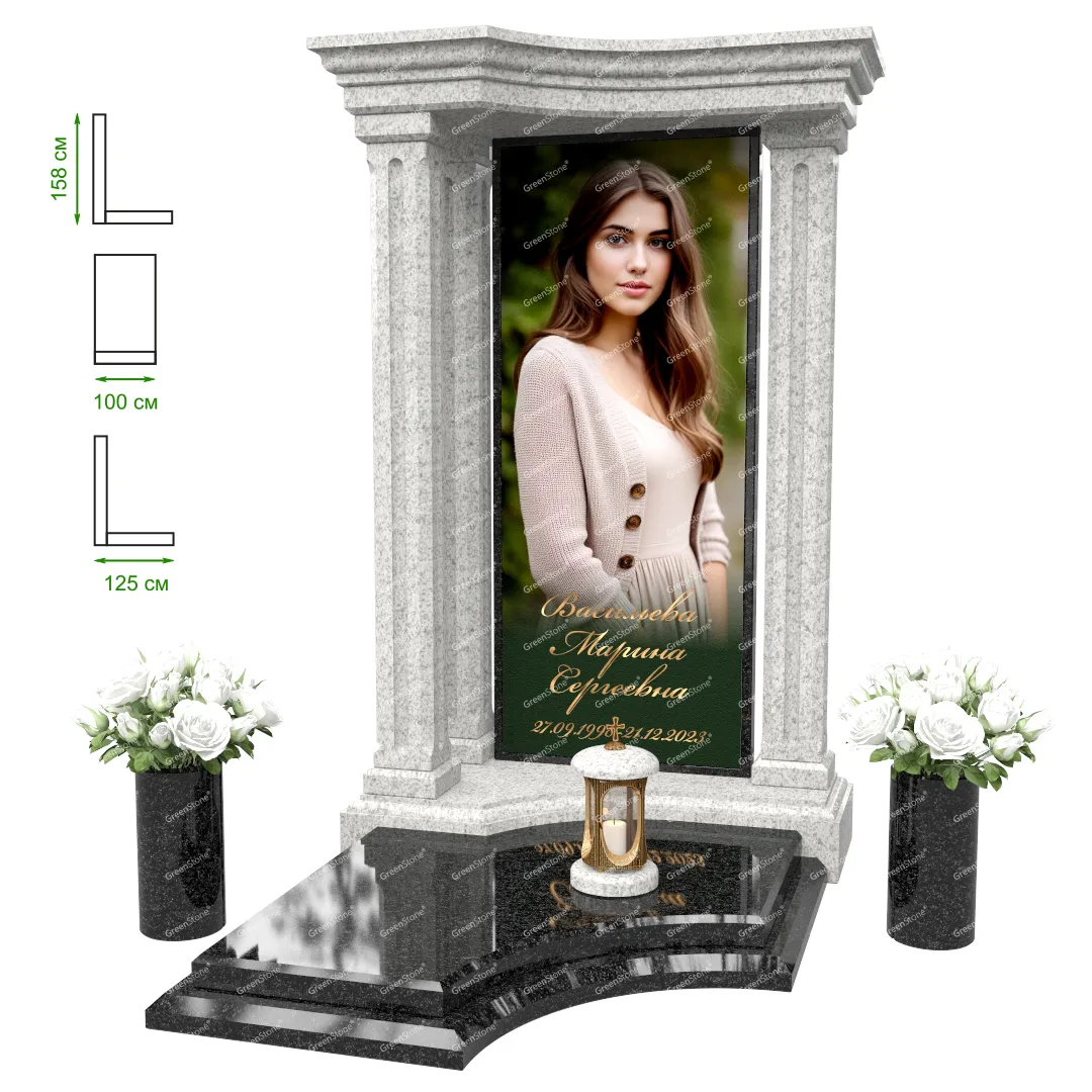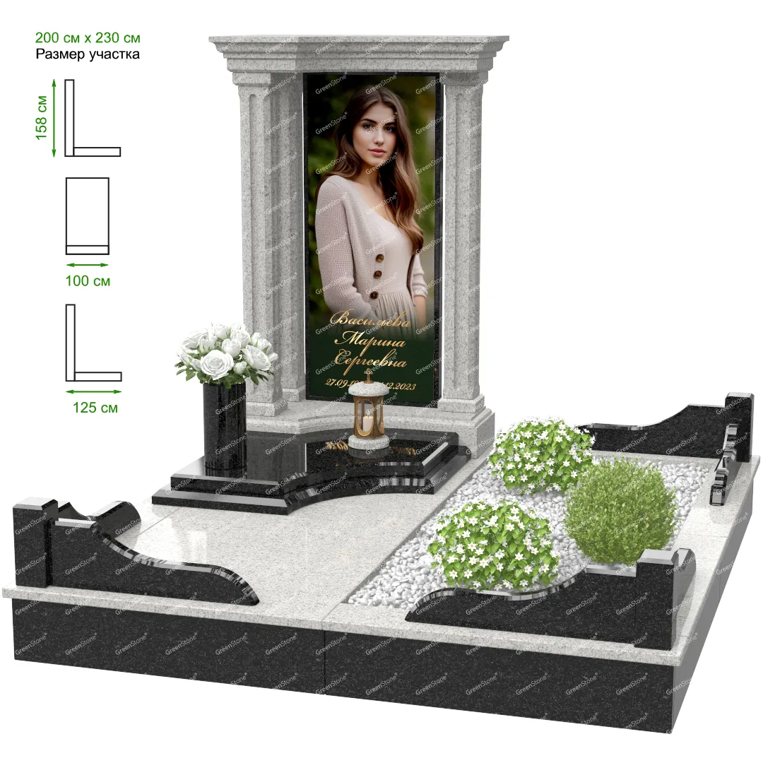 Визуально комплекс отличается от типовой формы не только формой, но и размерами. Массивная стела позволяет дизайнеру реализовать практически любые задумки и пожелания Заказчика, придать готовому изделию солидный вид, раскрыть все достоинства использованного в его изготовлении гранита. Такой габаритный памятник требует профессиональной доставки и установки. Все это также можно заказать в мастерской Грин-Стоун.