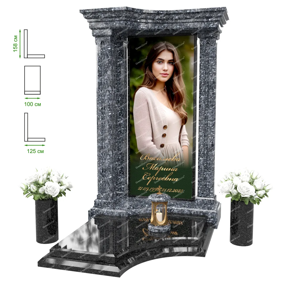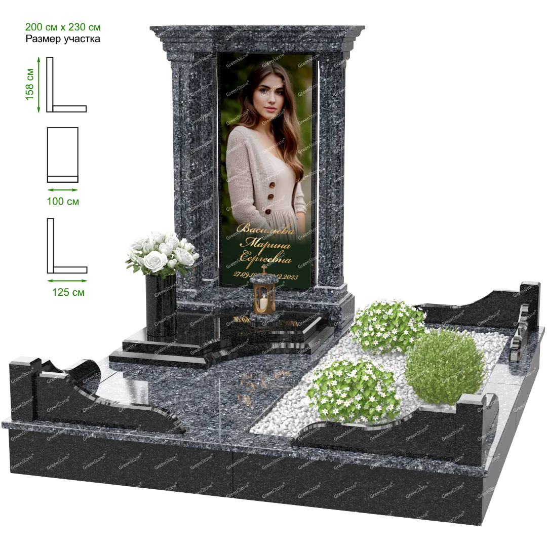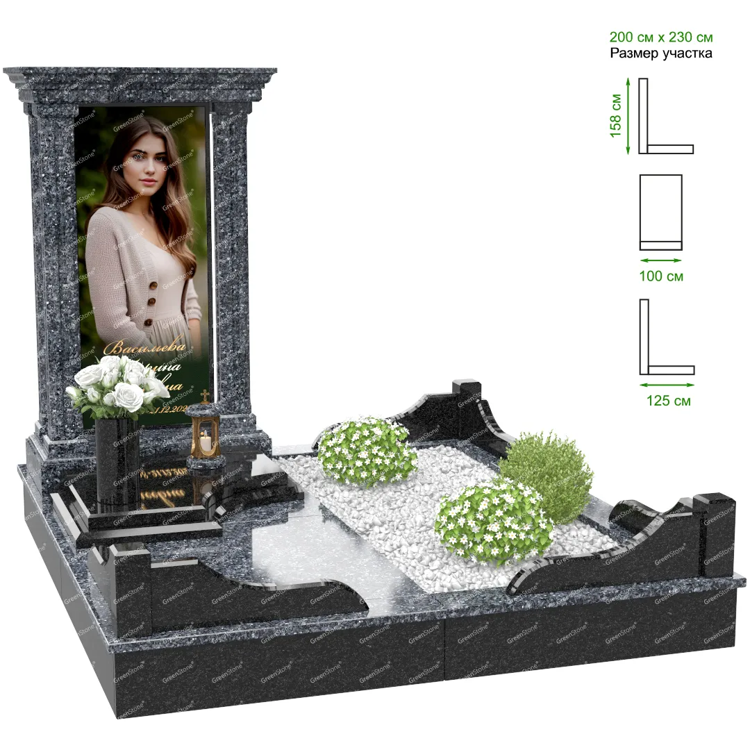 Визуально комплекс отличается от типовой формы не только формой, но и размерами. Массивная стела позволяет дизайнеру реализовать практически любые задумки и пожелания Заказчика, придать готовому изделию солидный вид, раскрыть все достоинства использованного в его изготовлении гранита. Такой габаритный памятник требует профессиональной доставки и установки. Все это также можно заказать в мастерской Грин-Стоун.