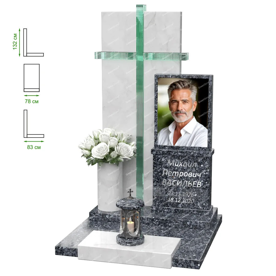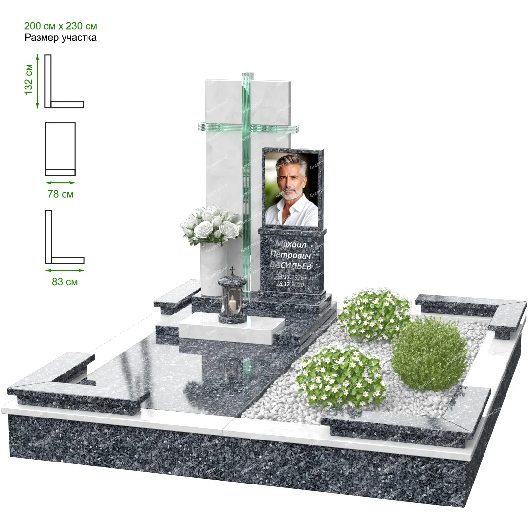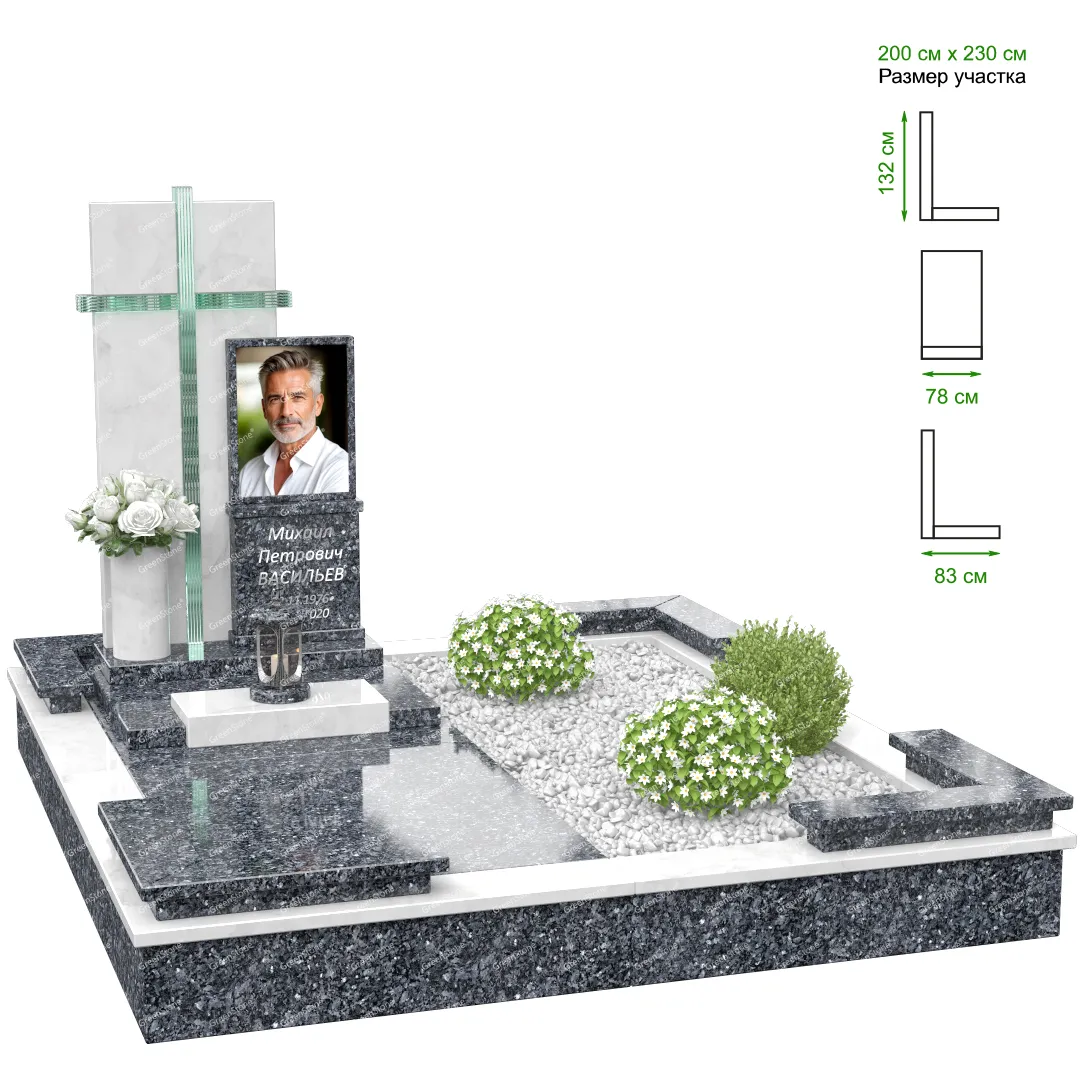Визуально комплекс отличается от типовой формы не только формой, но и размерами. Массивная стела позволяет дизайнеру реализовать практически любые задумки и пожелания Заказчика, придать готовому изделию солидный вид, раскрыть все достоинства использованного в его изготовлении гранита. Такой габаритный памятник требует профессиональной доставки и установки. Все это также можно заказать в мастерской Грин-Стоун.