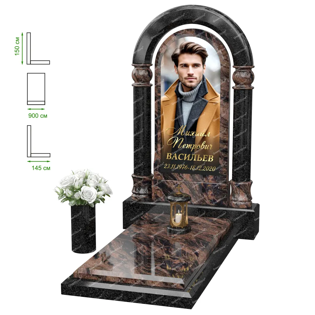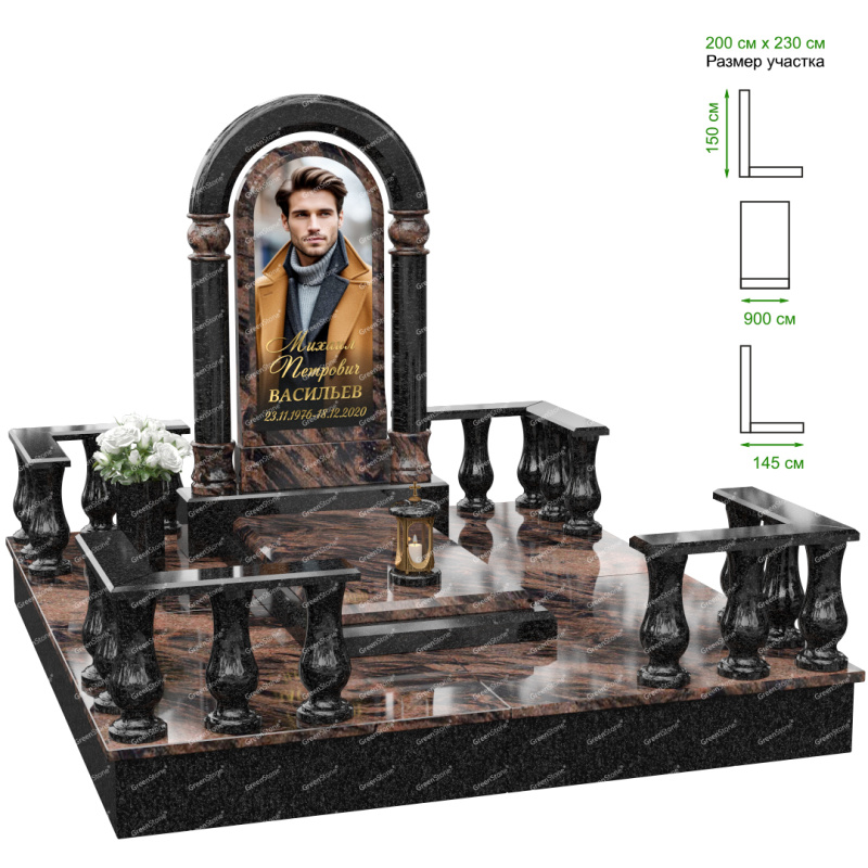 Визуально комплекс отличается от типовой формы не только формой, но и размерами. Массивная стела позволяет дизайнеру реализовать практически любые задумки и пожелания Заказчика, придать готовому изделию солидный вид, раскрыть все достоинства использованного в его изготовлении гранита. Такой габаритный памятник требует профессиональной доставки и установки. Все это также можно заказать в мастерской Грин-Стоун.