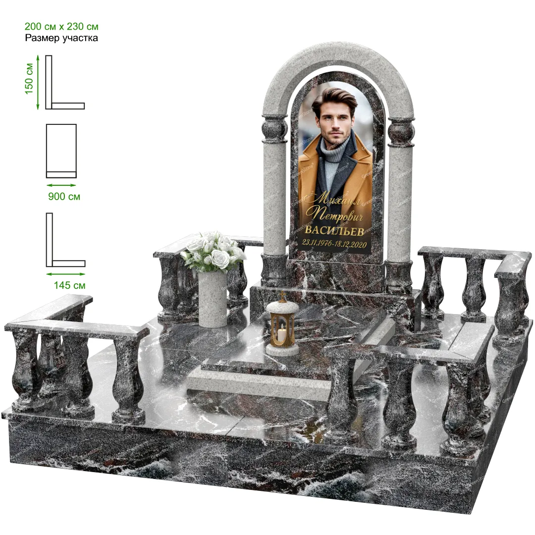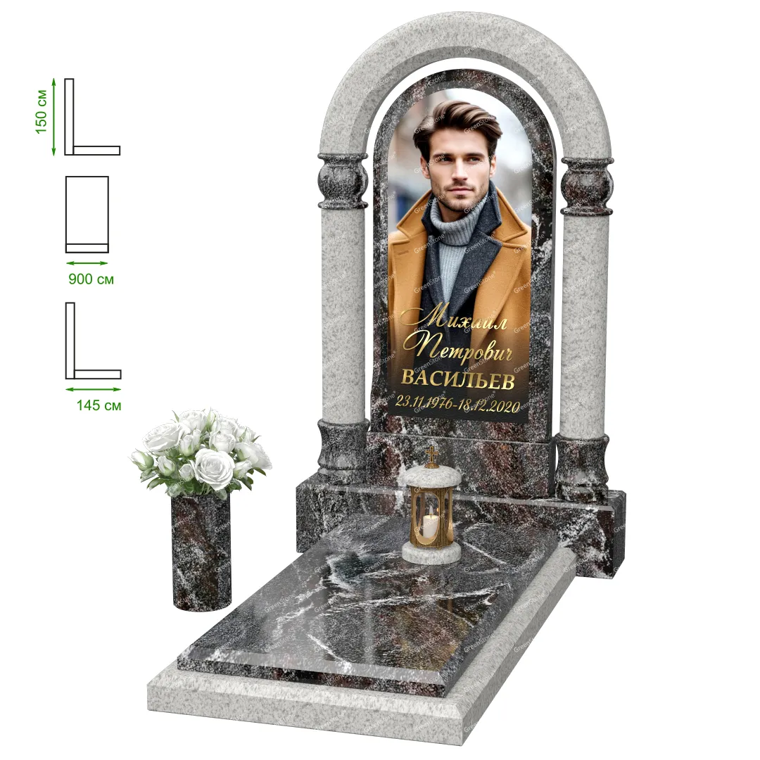 Визуально комплекс отличается от типовой формы не только формой, но и размерами. Массивная стела позволяет дизайнеру реализовать практически любые задумки и пожелания Заказчика, придать готовому изделию солидный вид, раскрыть все достоинства использованного в его изготовлении гранита. Такой габаритный памятник требует профессиональной доставки и установки. Все это также можно заказать в мастерской Грин-Стоун.