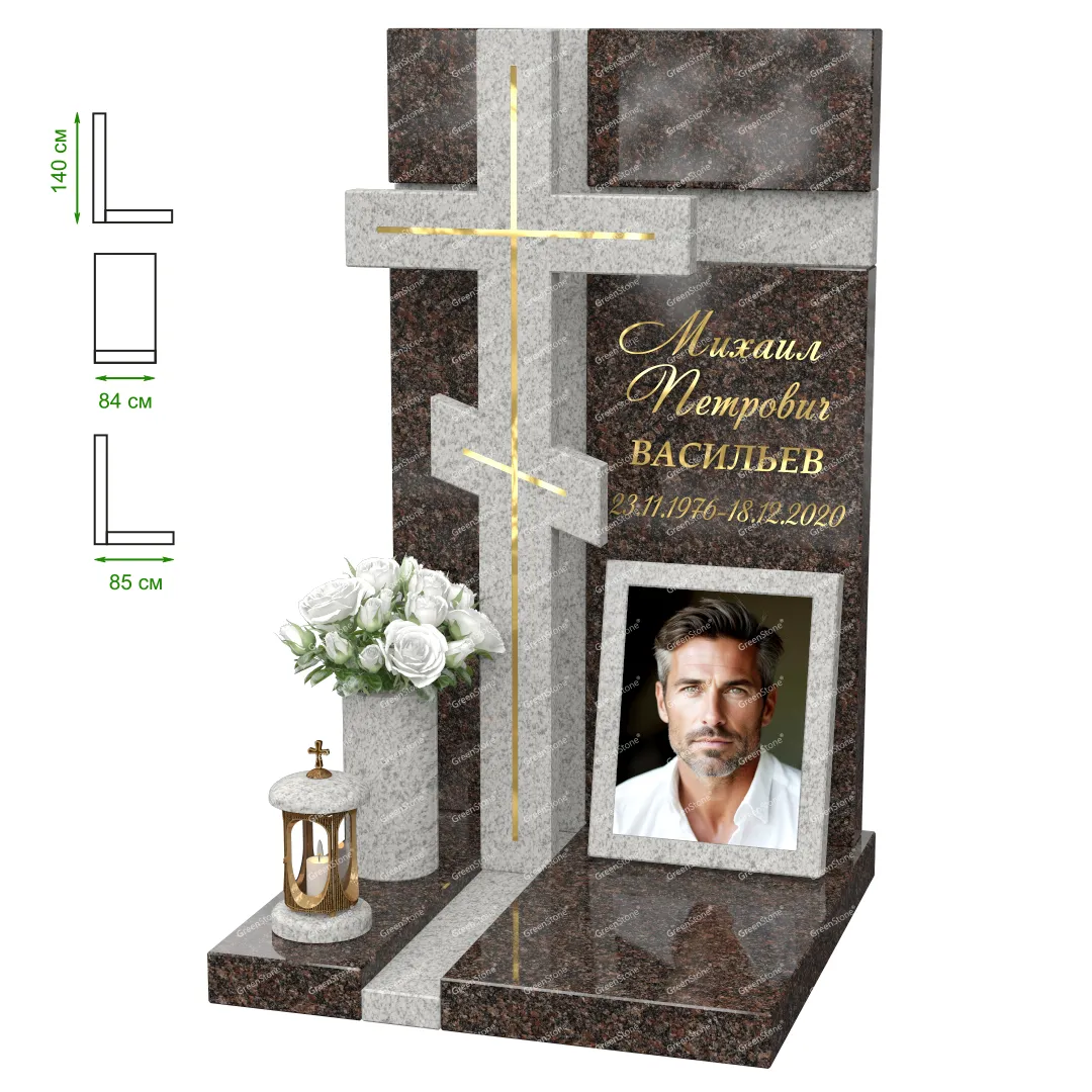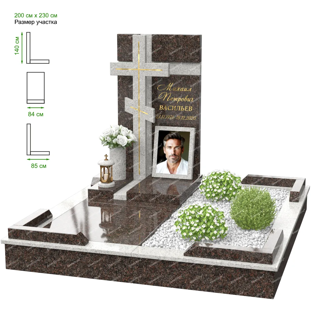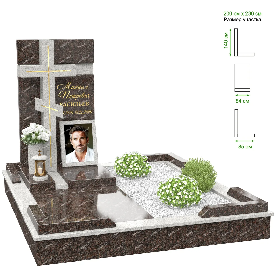 Визуально комплекс отличается от типовой формы не только формой, но и размерами. Массивная стела позволяет дизайнеру реализовать практически любые задумки и пожелания Заказчика, придать готовому изделию солидный вид, раскрыть все достоинства использованного в его изготовлении гранита. Такой габаритный памятник требует профессиональной доставки и установки. Все это также можно заказать в мастерской Грин-Стоун.