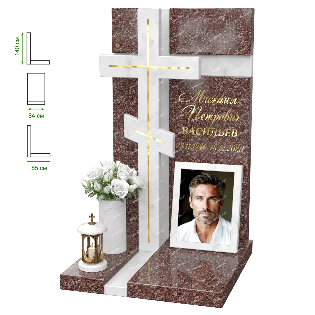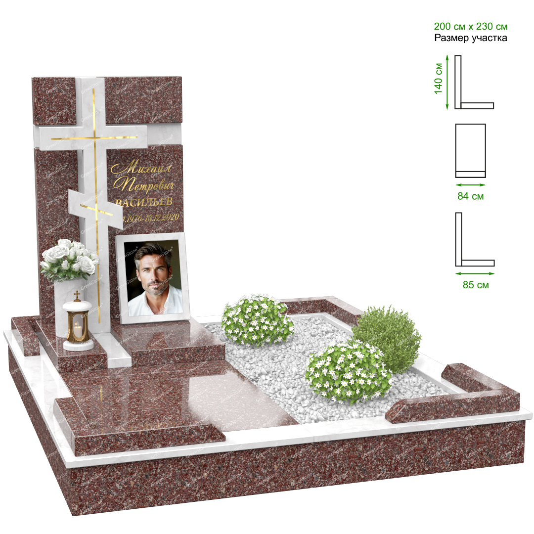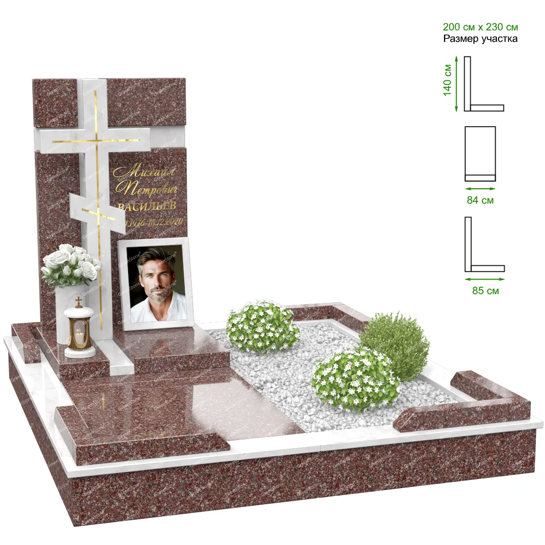 Визуально комплекс отличается от типовой формы не только формой, но и размерами. Массивная стела позволяет дизайнеру реализовать практически любые задумки и пожелания Заказчика, придать готовому изделию солидный вид, раскрыть все достоинства использованного в его изготовлении гранита. Такой габаритный памятник требует профессиональной доставки и установки. Все это также можно заказать в мастерской Грин-Стоун.