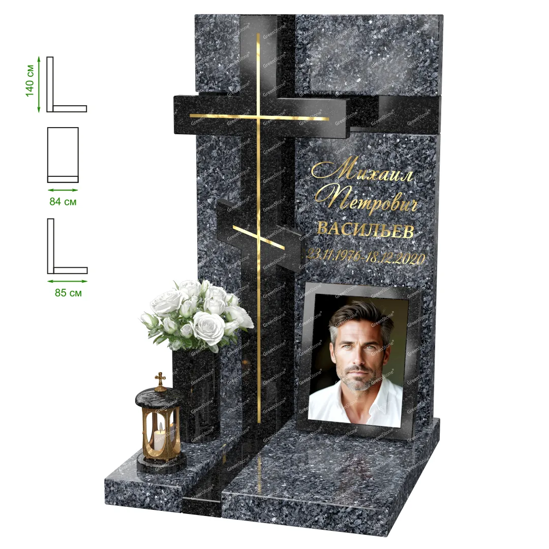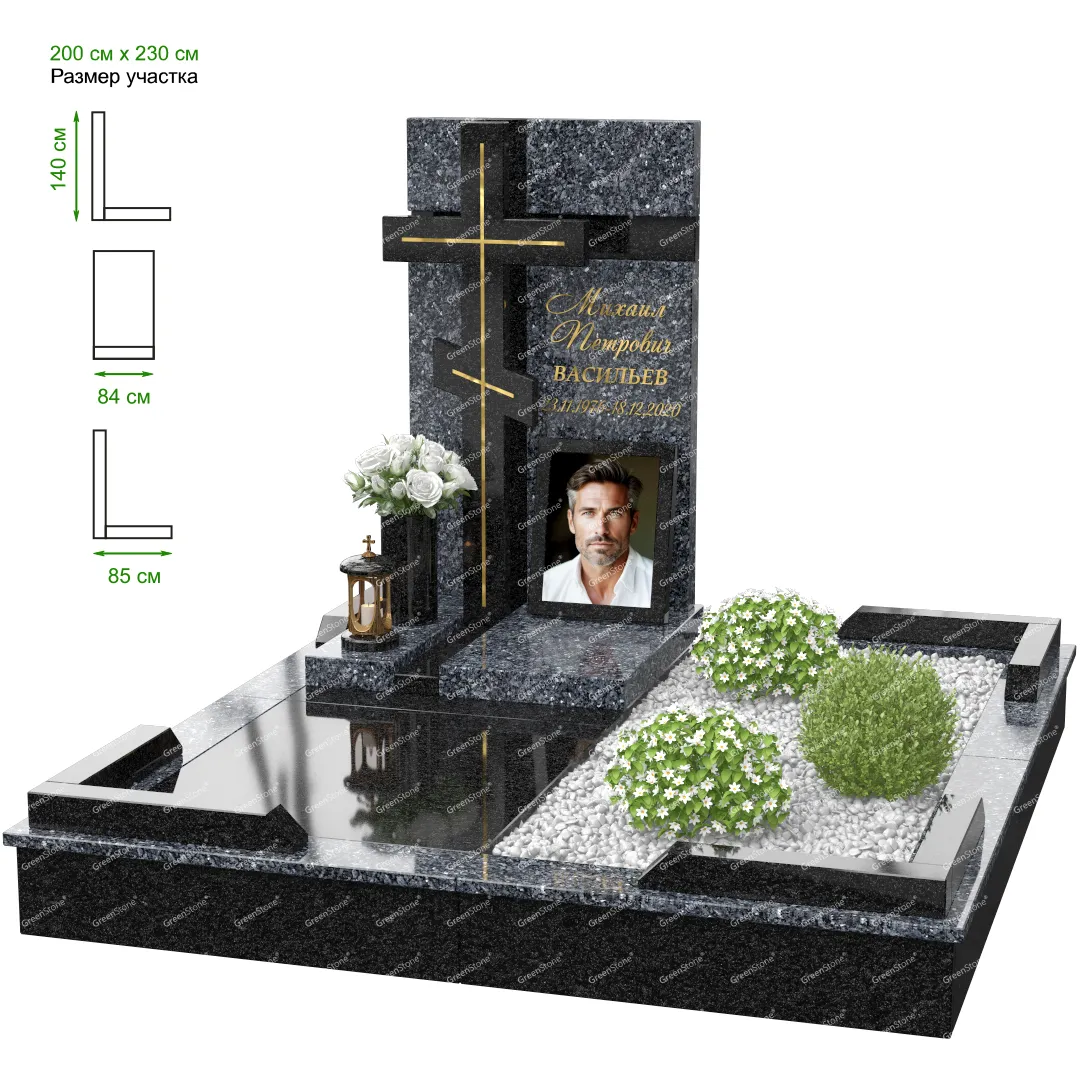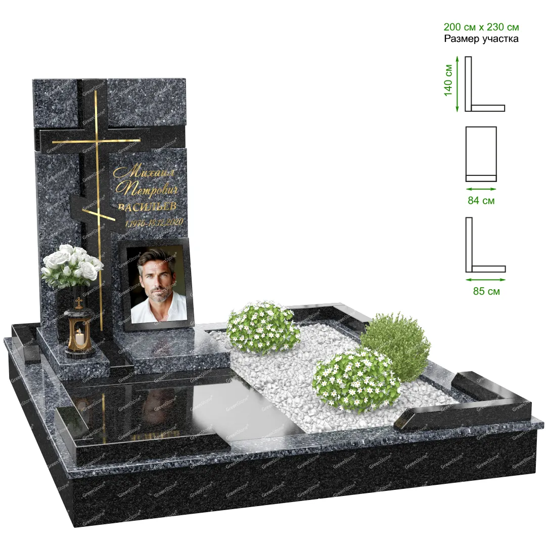 Визуально комплекс отличается от типовой формы не только формой, но и размерами. Массивная стела позволяет дизайнеру реализовать практически любые задумки и пожелания Заказчика, придать готовому изделию солидный вид, раскрыть все достоинства использованного в его изготовлении гранита. Такой габаритный памятник требует профессиональной доставки и установки. Все это также можно заказать в мастерской Грин-Стоун.