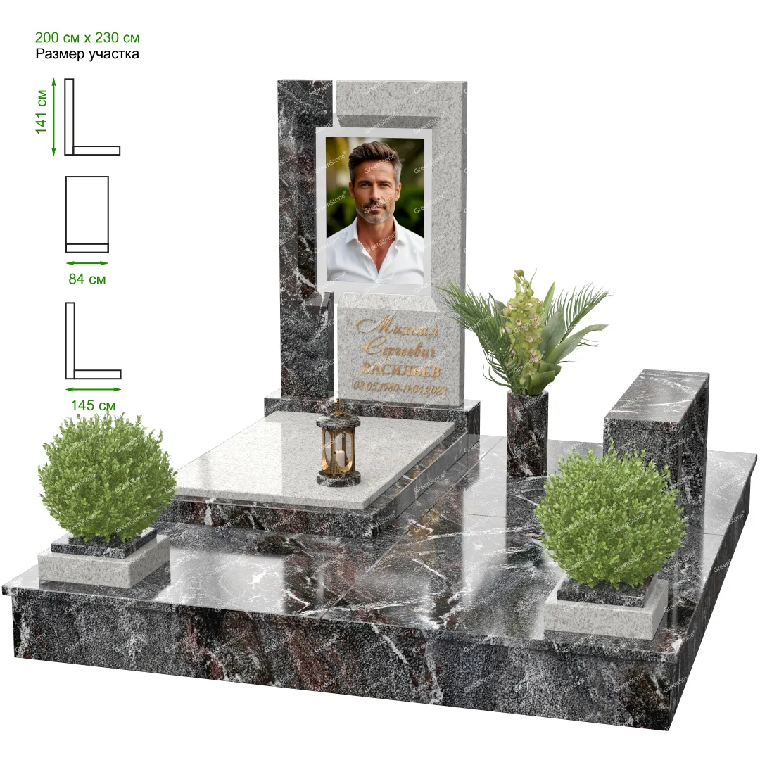 Визуально комплекс отличается от типовой формы не только формой, но и размерами. Массивная стела позволяет дизайнеру реализовать практически любые задумки и пожелания Заказчика, придать готовому изделию солидный вид, раскрыть все достоинства использованного в его изготовлении гранита. Такой габаритный памятник требует профессиональной доставки и установки. Все это также можно заказать в мастерской Грин-Стоун.