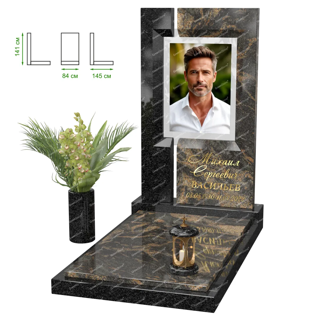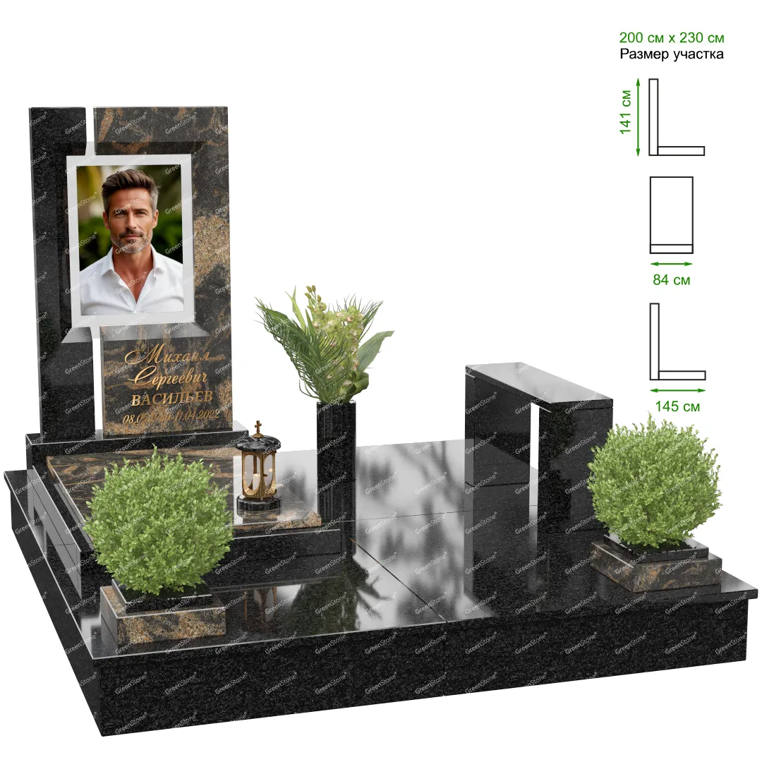 Визуально комплекс отличается от типовой формы не только формой, но и размерами. Массивная стела позволяет дизайнеру реализовать практически любые задумки и пожелания Заказчика, придать готовому изделию солидный вид, раскрыть все достоинства использованного в его изготовлении гранита. Такой габаритный памятник требует профессиональной доставки и установки. Все это также можно заказать в мастерской Грин-Стоун.