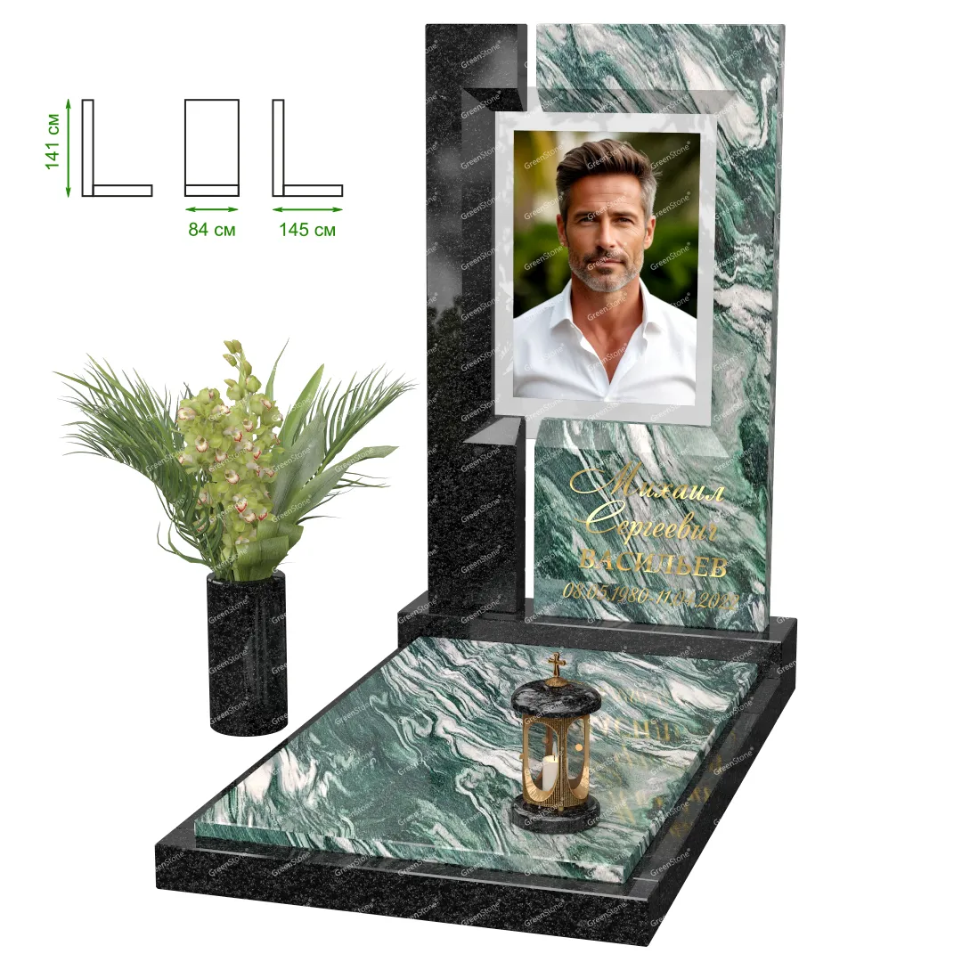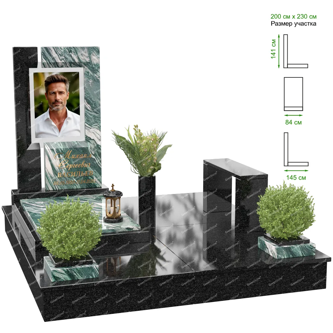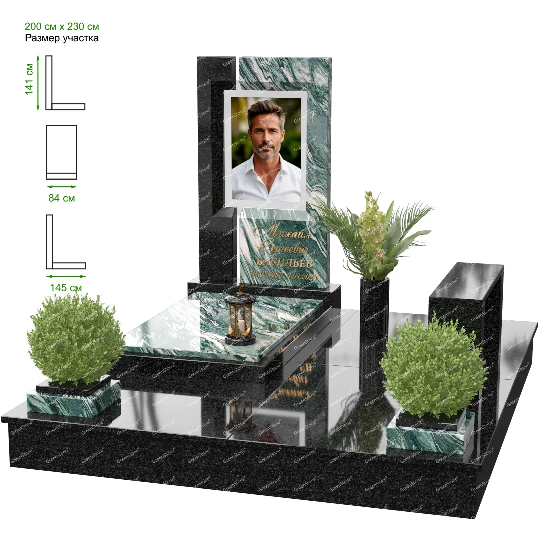 Визуально комплекс отличается от типовой формы не только формой, но и размерами. Массивная стела позволяет дизайнеру реализовать практически любые задумки и пожелания Заказчика, придать готовому изделию солидный вид, раскрыть все достоинства использованного в его изготовлении гранита. Такой габаритный памятник требует профессиональной доставки и установки. Все это также можно заказать в мастерской Грин-Стоун.