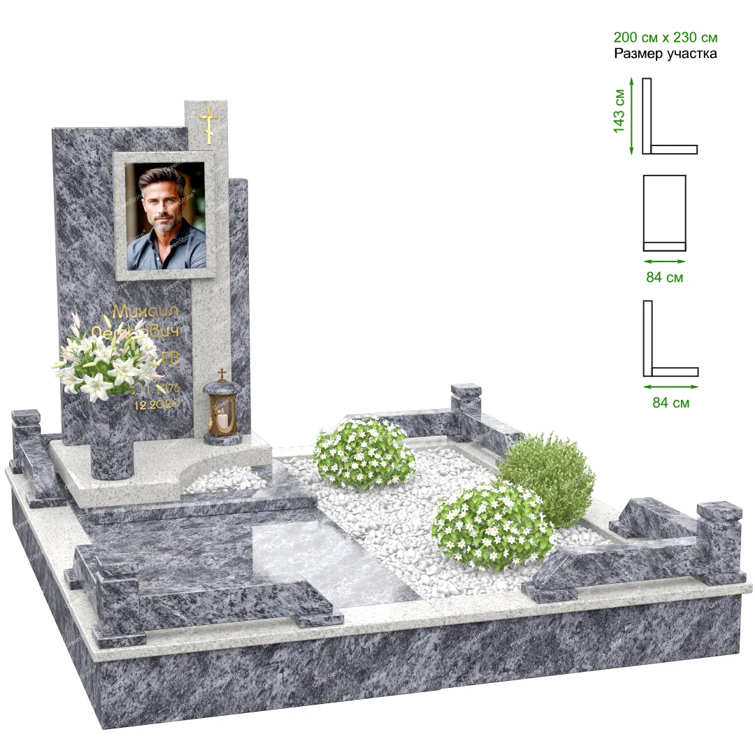 Визуально комплекс отличается от типовой формы не только формой, но и размерами. Массивная стела позволяет дизайнеру реализовать практически любые задумки и пожелания Заказчика, придать готовому изделию солидный вид, раскрыть все достоинства использованного в его изготовлении гранита. Такой габаритный памятник требует профессиональной доставки и установки. Все это также можно заказать в мастерской Грин-Стоун.
