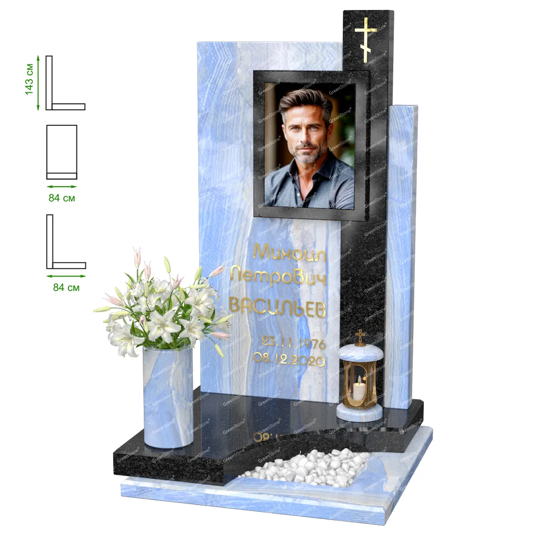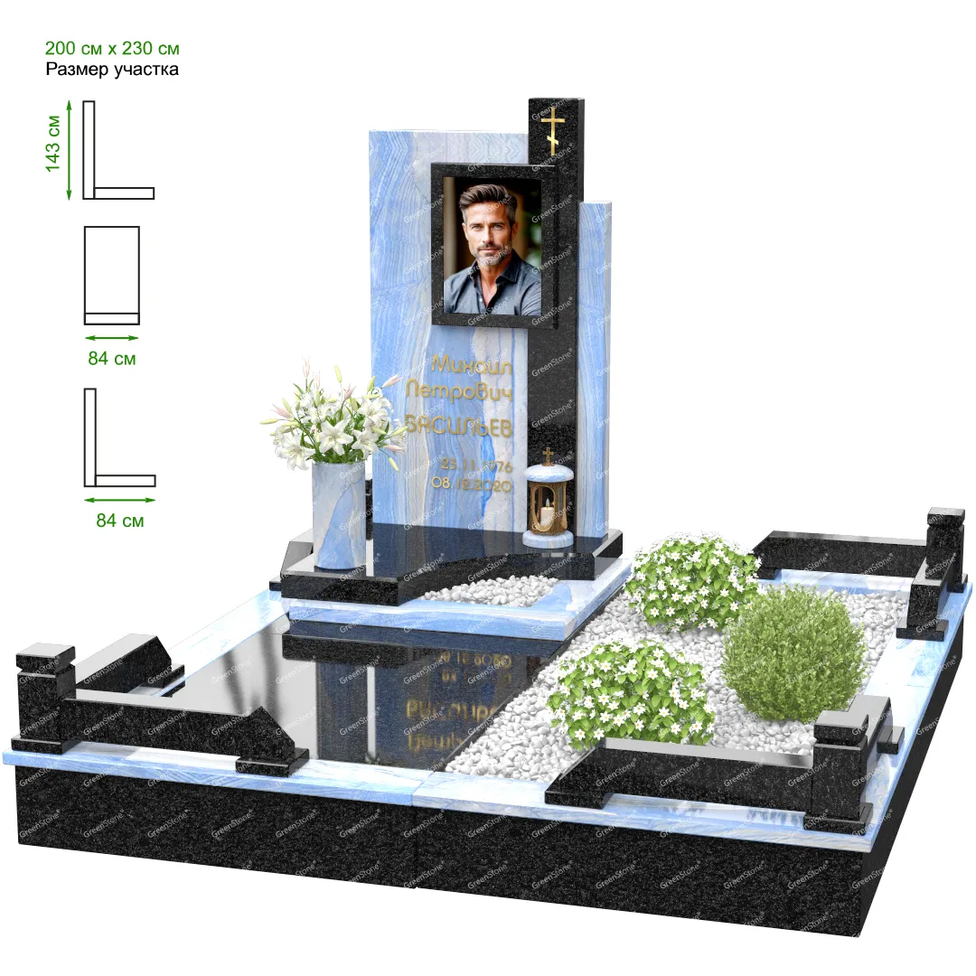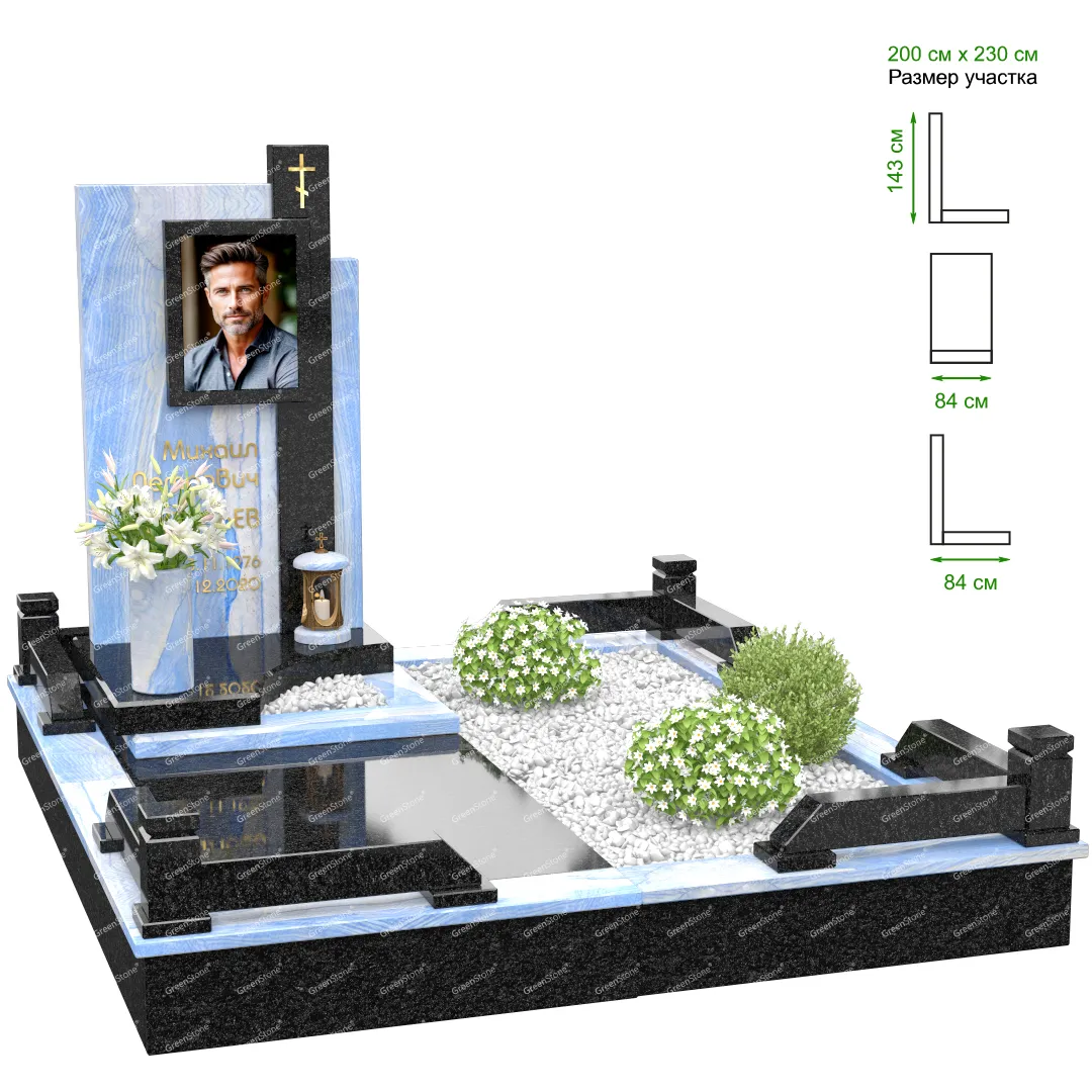 Визуально комплекс отличается от типовой формы не только формой, но и размерами. Массивная стела позволяет дизайнеру реализовать практически любые задумки и пожелания Заказчика, придать готовому изделию солидный вид, раскрыть все достоинства использованного в его изготовлении гранита. Такой габаритный памятник требует профессиональной доставки и установки. Все это также можно заказать в мастерской Грин-Стоун.