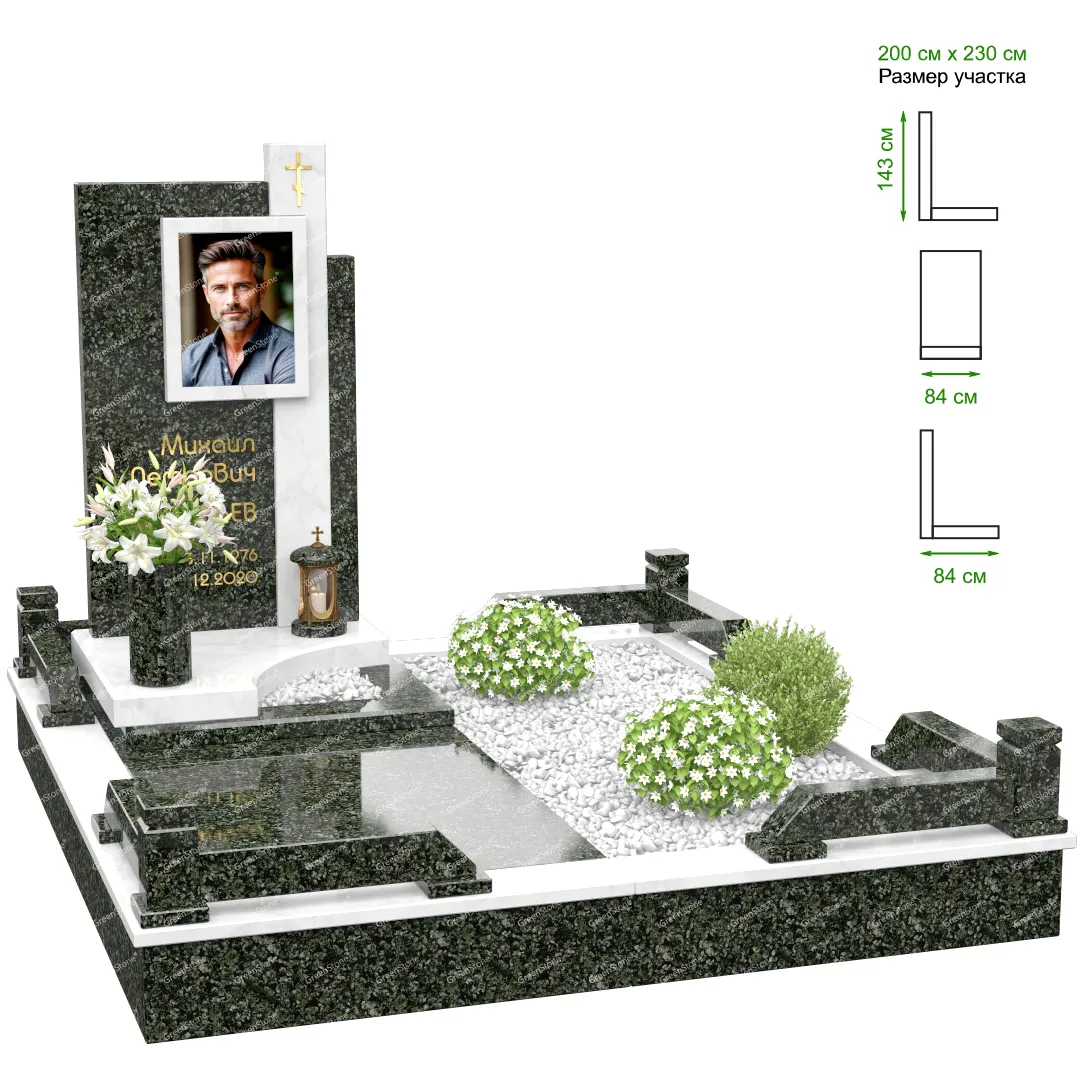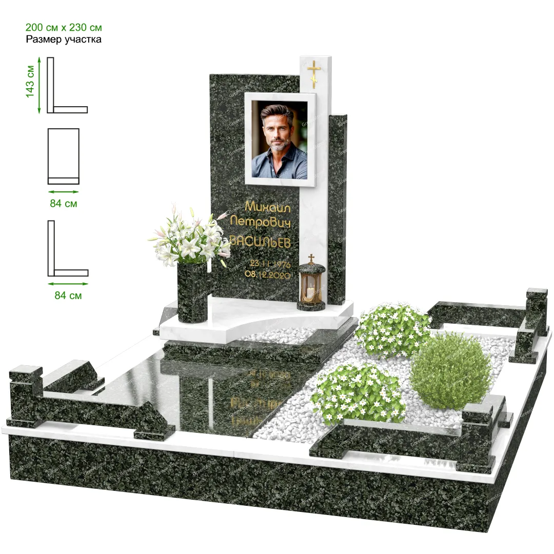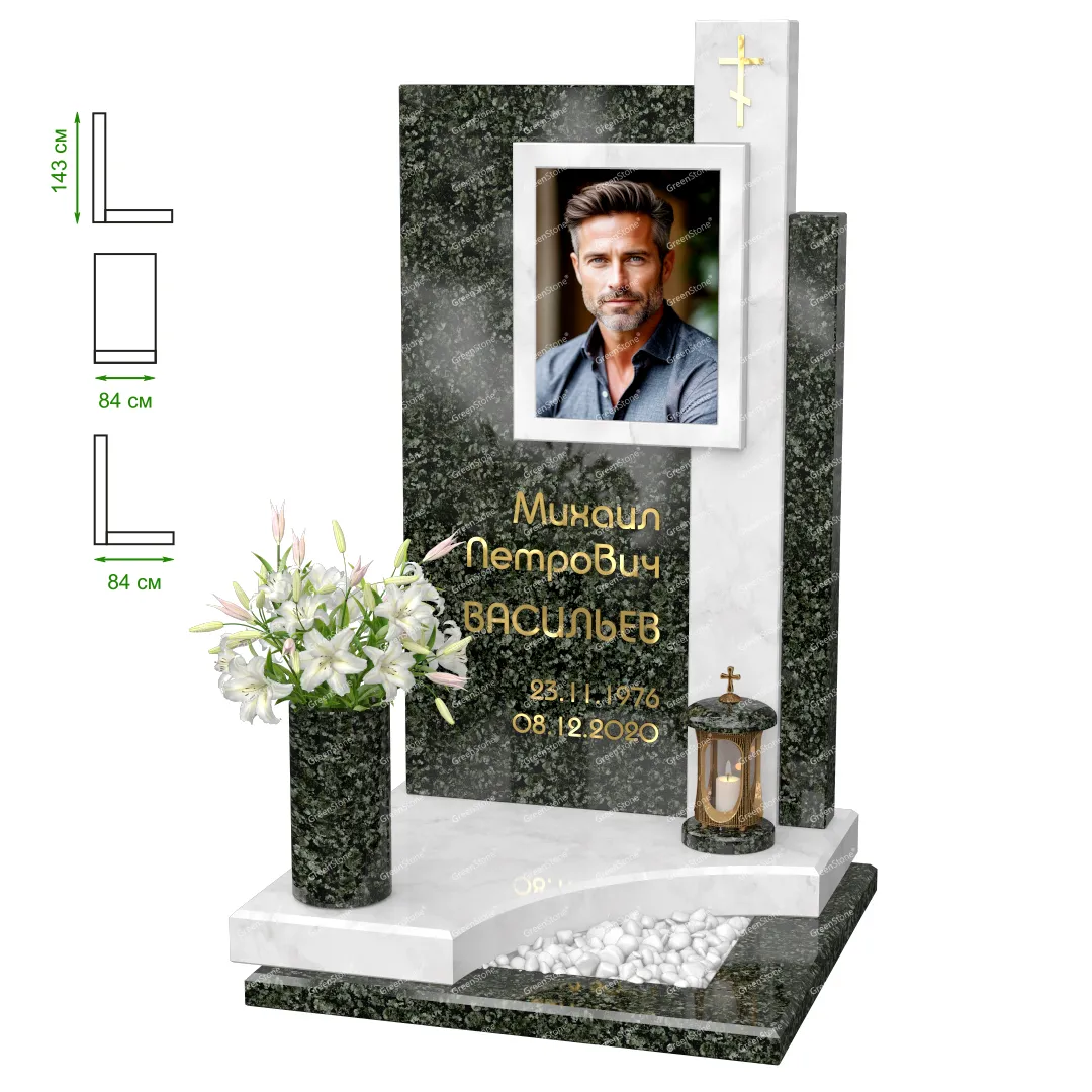 Визуально комплекс отличается от типовой формы не только формой, но и размерами. Массивная стела позволяет дизайнеру реализовать практически любые задумки и пожелания Заказчика, придать готовому изделию солидный вид, раскрыть все достоинства использованного в его изготовлении гранита. Такой габаритный памятник требует профессиональной доставки и установки. Все это также можно заказать в мастерской Грин-Стоун.