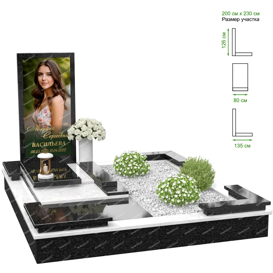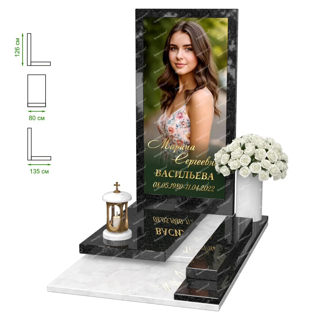 Визуально комплекс отличается от типовой формы не только формой, но и размерами. Массивная стела позволяет дизайнеру реализовать практически любые задумки и пожелания Заказчика, придать готовому изделию солидный вид, раскрыть все достоинства использованного в его изготовлении гранита. Такой габаритный памятник требует профессиональной доставки и установки. Все это также можно заказать в мастерской Грин-Стоун.