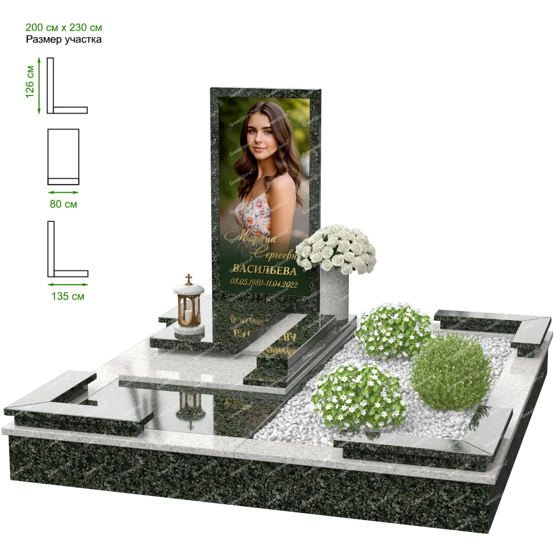 Визуально комплекс отличается от типовой формы не только формой, но и размерами. Массивная стела позволяет дизайнеру реализовать практически любые задумки и пожелания Заказчика, придать готовому изделию солидный вид, раскрыть все достоинства использованного в его изготовлении гранита. Такой габаритный памятник требует профессиональной доставки и установки. Все это также можно заказать в мастерской Грин-Стоун.