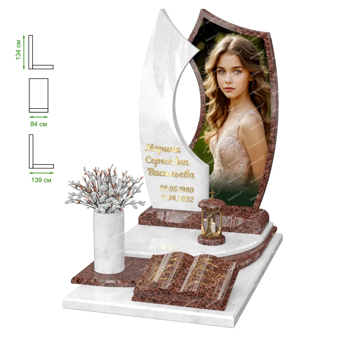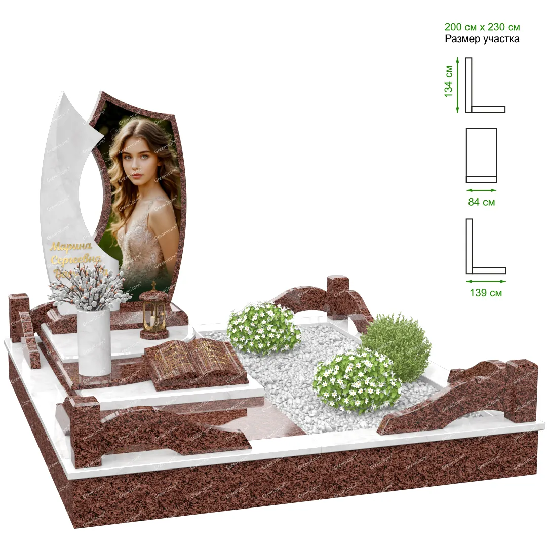 Визуально комплекс отличается от типовой формы не только формой, но и размерами. Массивная стела позволяет дизайнеру реализовать практически любые задумки и пожелания Заказчика, придать готовому изделию солидный вид, раскрыть все достоинства использованного в его изготовлении гранита. Такой габаритный памятник требует профессиональной доставки и установки. Все это также можно заказать в мастерской Грин-Стоун.
