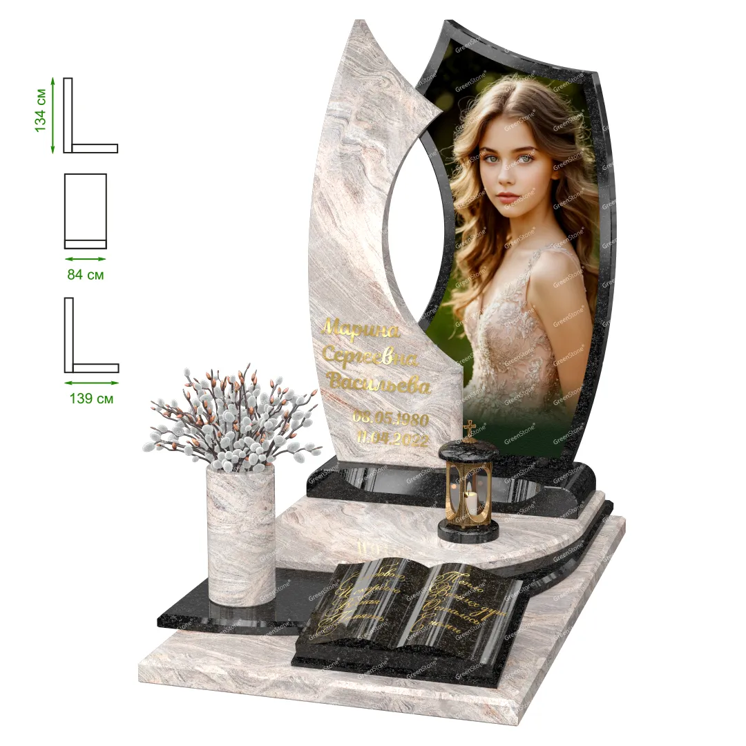 Визуально комплекс отличается от типовой формы не только формой, но и размерами. Массивная стела позволяет дизайнеру реализовать практически любые задумки и пожелания Заказчика, придать готовому изделию солидный вид, раскрыть все достоинства использованного в его изготовлении гранита. Такой габаритный памятник требует профессиональной доставки и установки. Все это также можно заказать в мастерской Грин-Стоун.