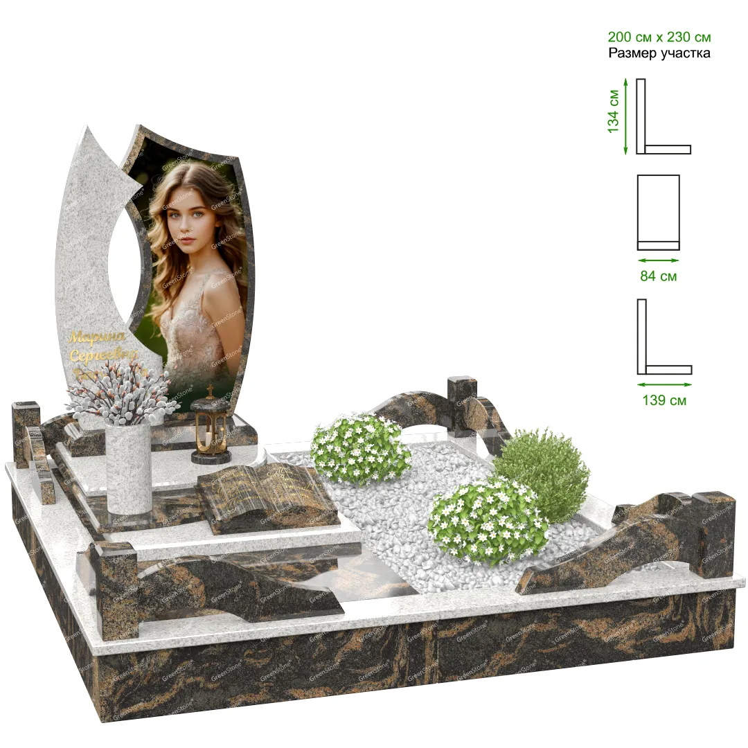 Визуально комплекс отличается от типовой формы не только формой, но и размерами. Массивная стела позволяет дизайнеру реализовать практически любые задумки и пожелания Заказчика, придать готовому изделию солидный вид, раскрыть все достоинства использованного в его изготовлении гранита. Такой габаритный памятник требует профессиональной доставки и установки. Все это также можно заказать в мастерской Грин-Стоун.
