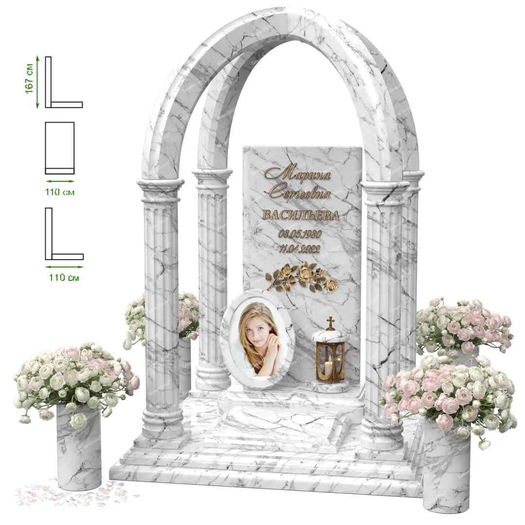 Визуально комплекс отличается от типовой формы не только формой, но и размерами. Массивная стела позволяет дизайнеру реализовать практически любые задумки и пожелания Заказчика, придать готовому изделию солидный вид, раскрыть все достоинства использованного в его изготовлении гранита. Такой габаритный памятник требует профессиональной доставки и установки. Все это также можно заказать в мастерской Грин-Стоун.