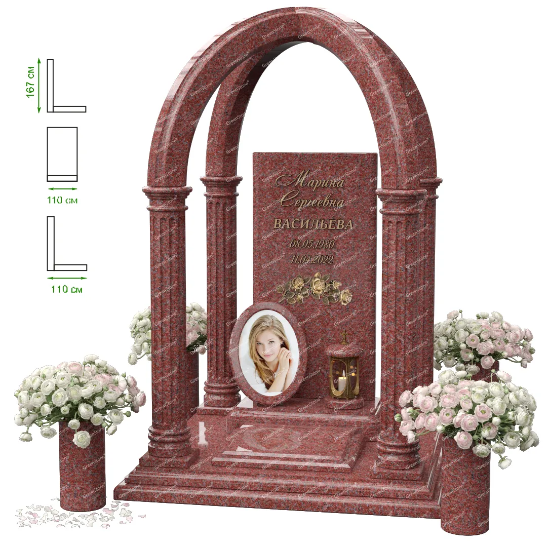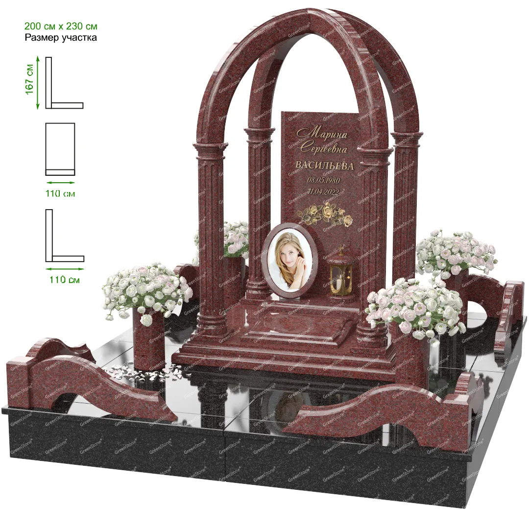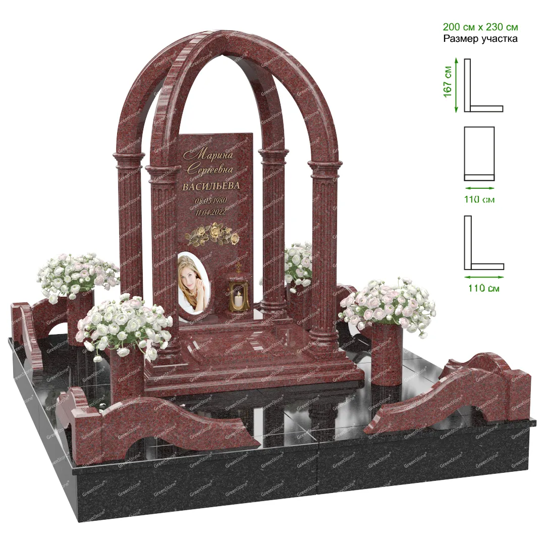 Визуально комплекс отличается от типовой формы не только формой, но и размерами. Массивная стела позволяет дизайнеру реализовать практически любые задумки и пожелания Заказчика, придать готовому изделию солидный вид, раскрыть все достоинства использованного в его изготовлении гранита. Такой габаритный памятник требует профессиональной доставки и установки. Все это также можно заказать в мастерской Грин-Стоун.