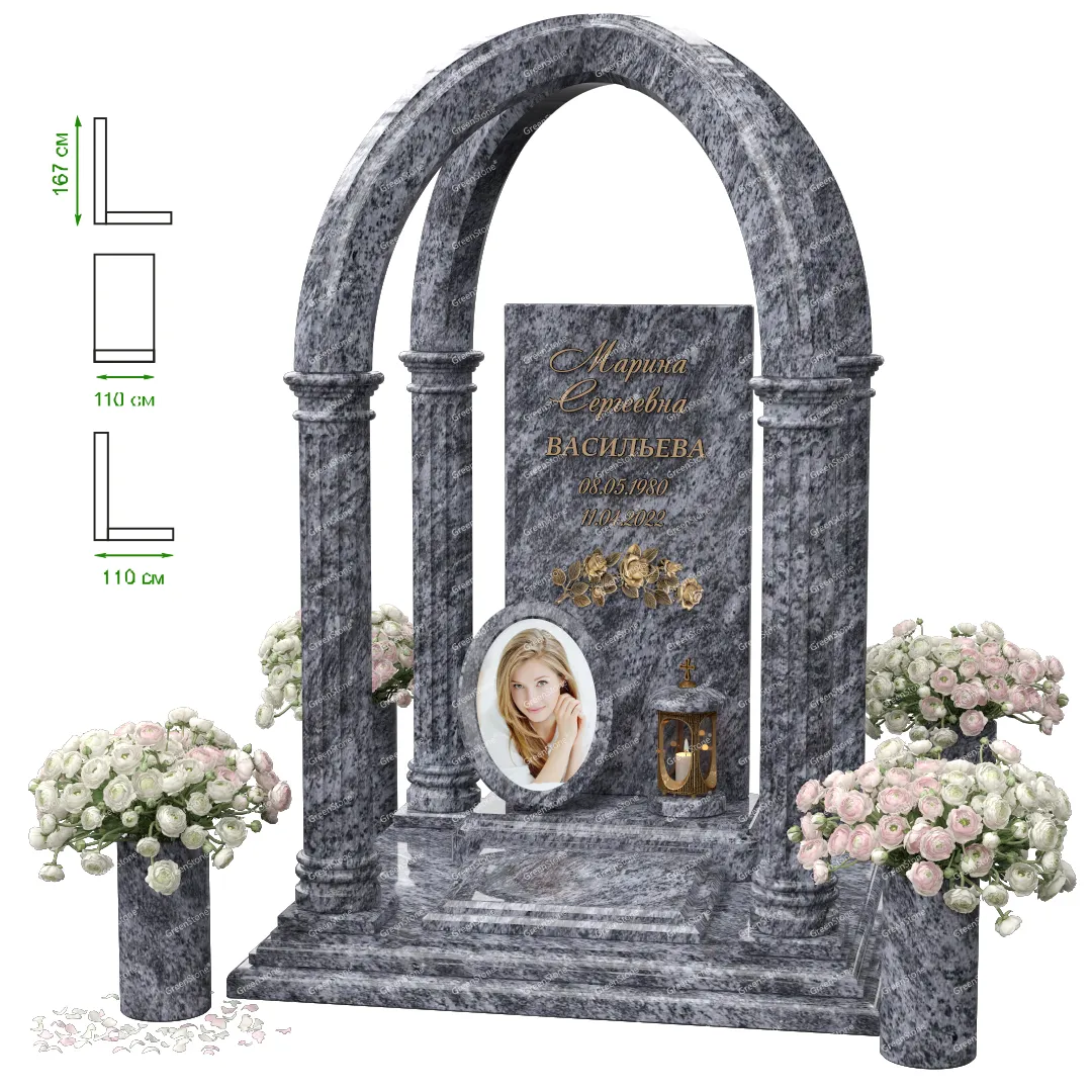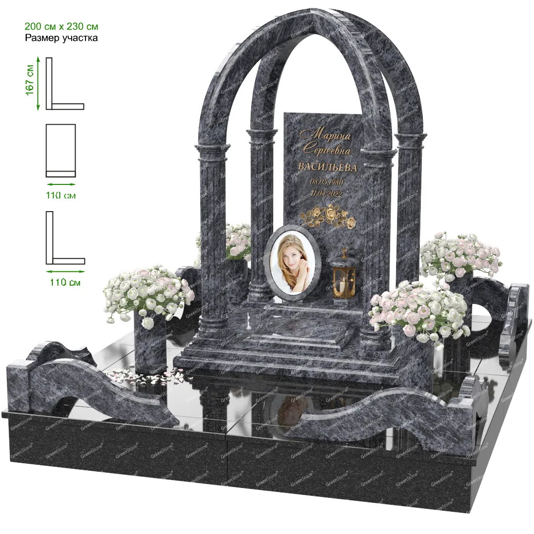 Визуально комплекс отличается от типовой формы не только формой, но и размерами. Массивная стела позволяет дизайнеру реализовать практически любые задумки и пожелания Заказчика, придать готовому изделию солидный вид, раскрыть все достоинства использованного в его изготовлении гранита. Такой габаритный памятник требует профессиональной доставки и установки. Все это также можно заказать в мастерской Грин-Стоун.