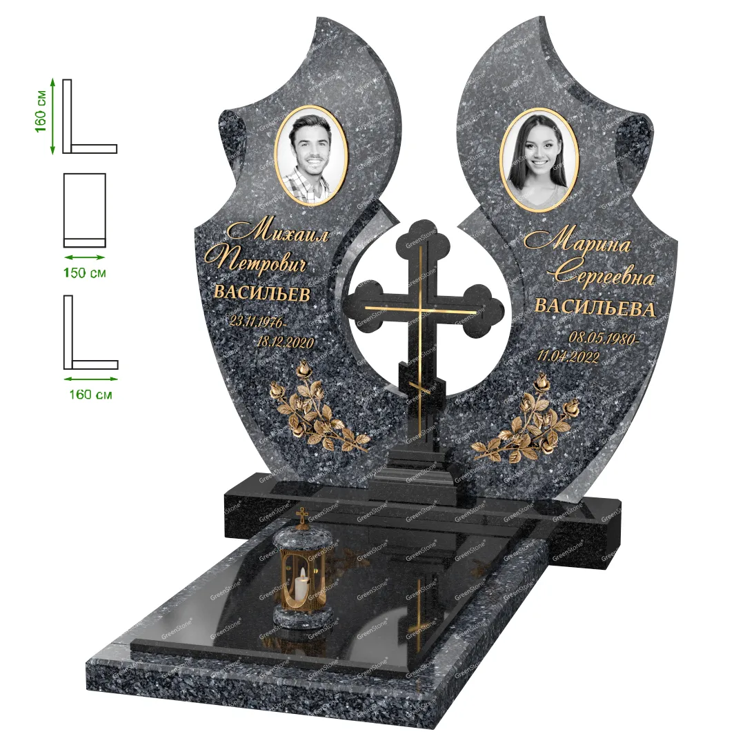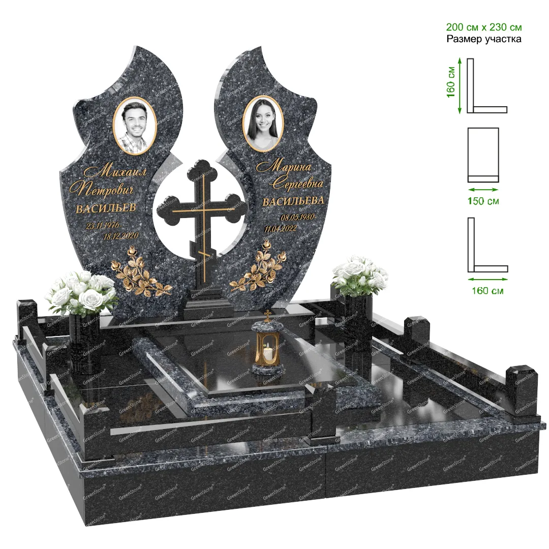 Визуально комплекс отличается от типовой формы не только формой, но и размерами. Массивная стела позволяет дизайнеру реализовать практически любые задумки и пожелания Заказчика, придать готовому изделию солидный вид, раскрыть все достоинства использованного в его изготовлении гранита. Такой габаритный памятник требует профессиональной доставки и установки. Все это также можно заказать в мастерской Грин-Стоун.