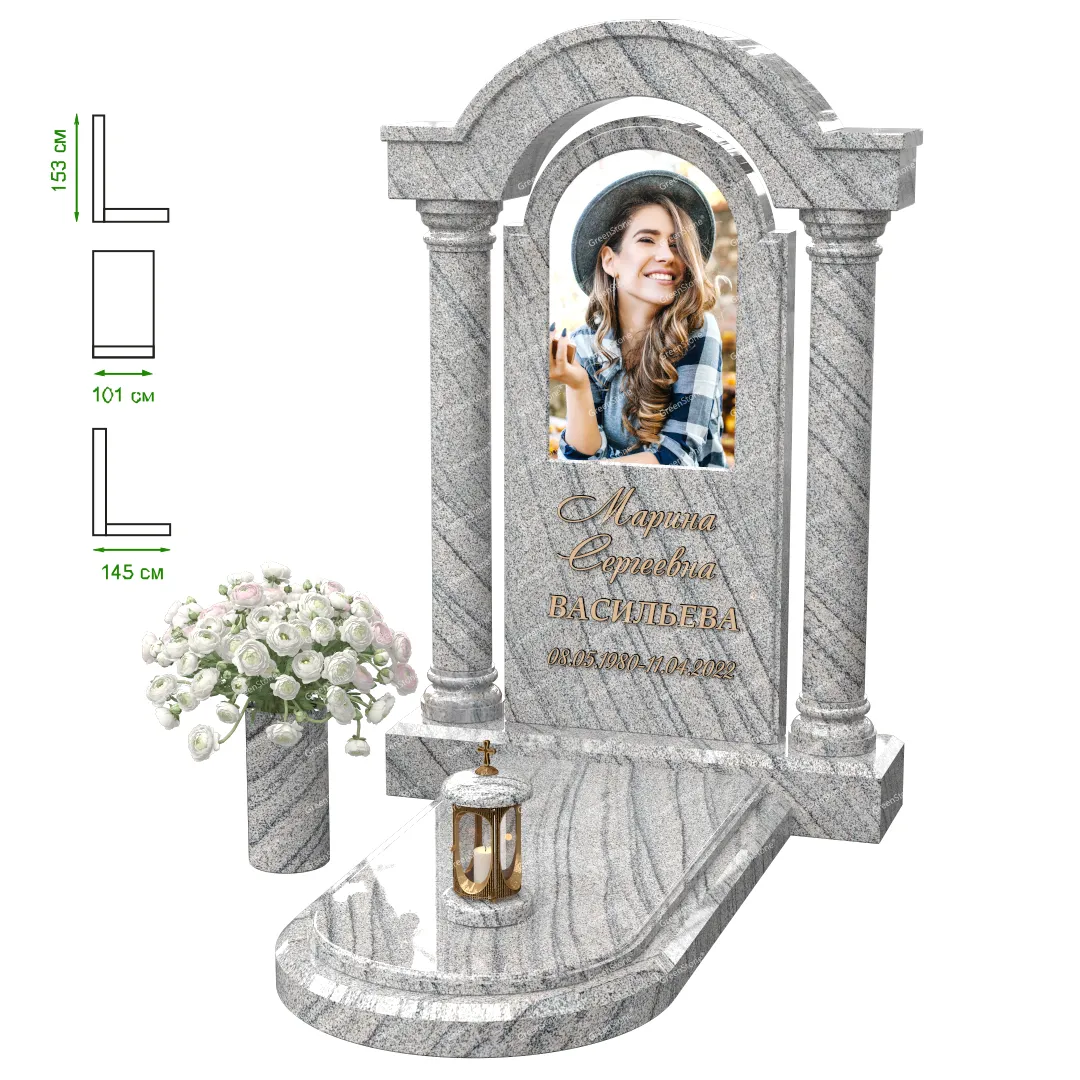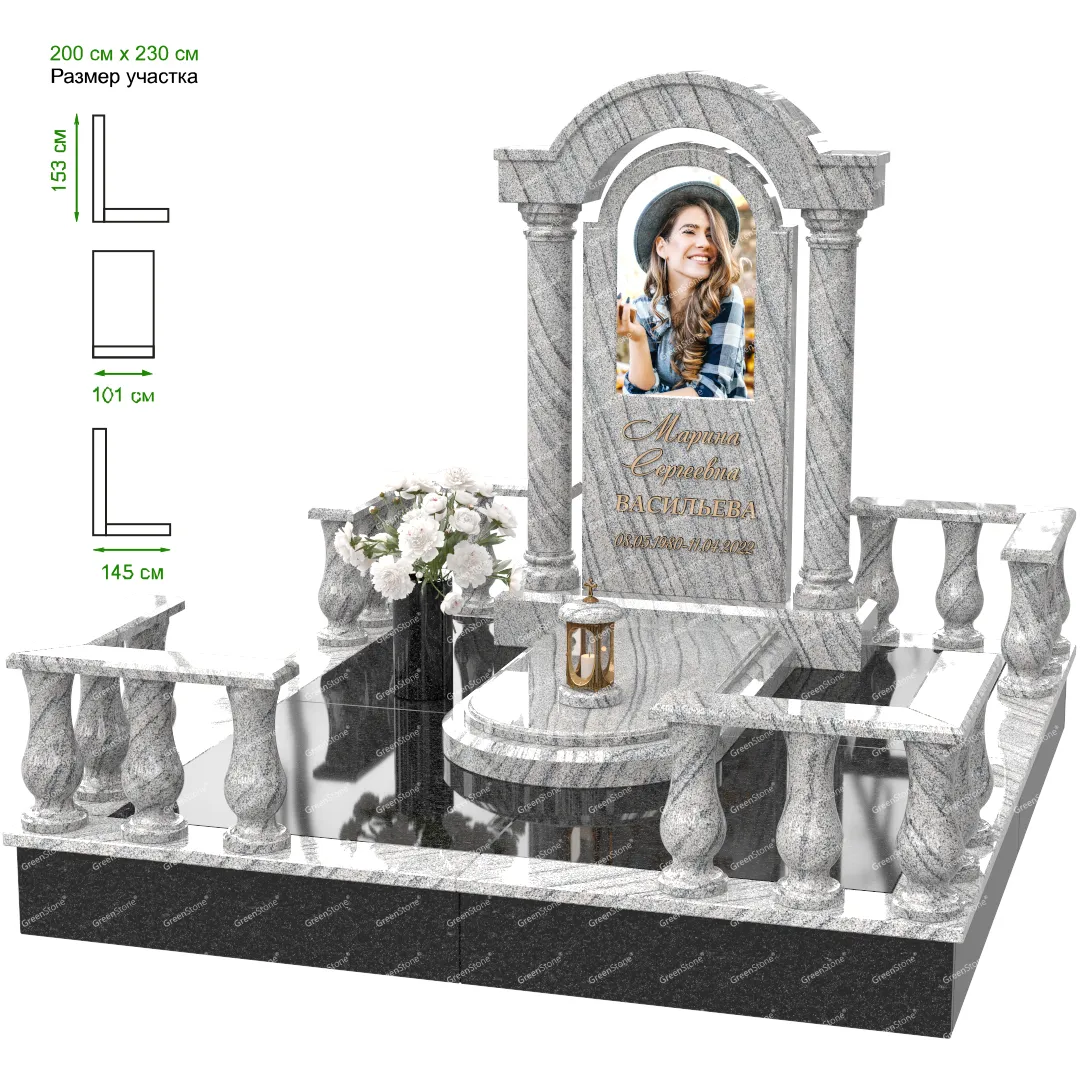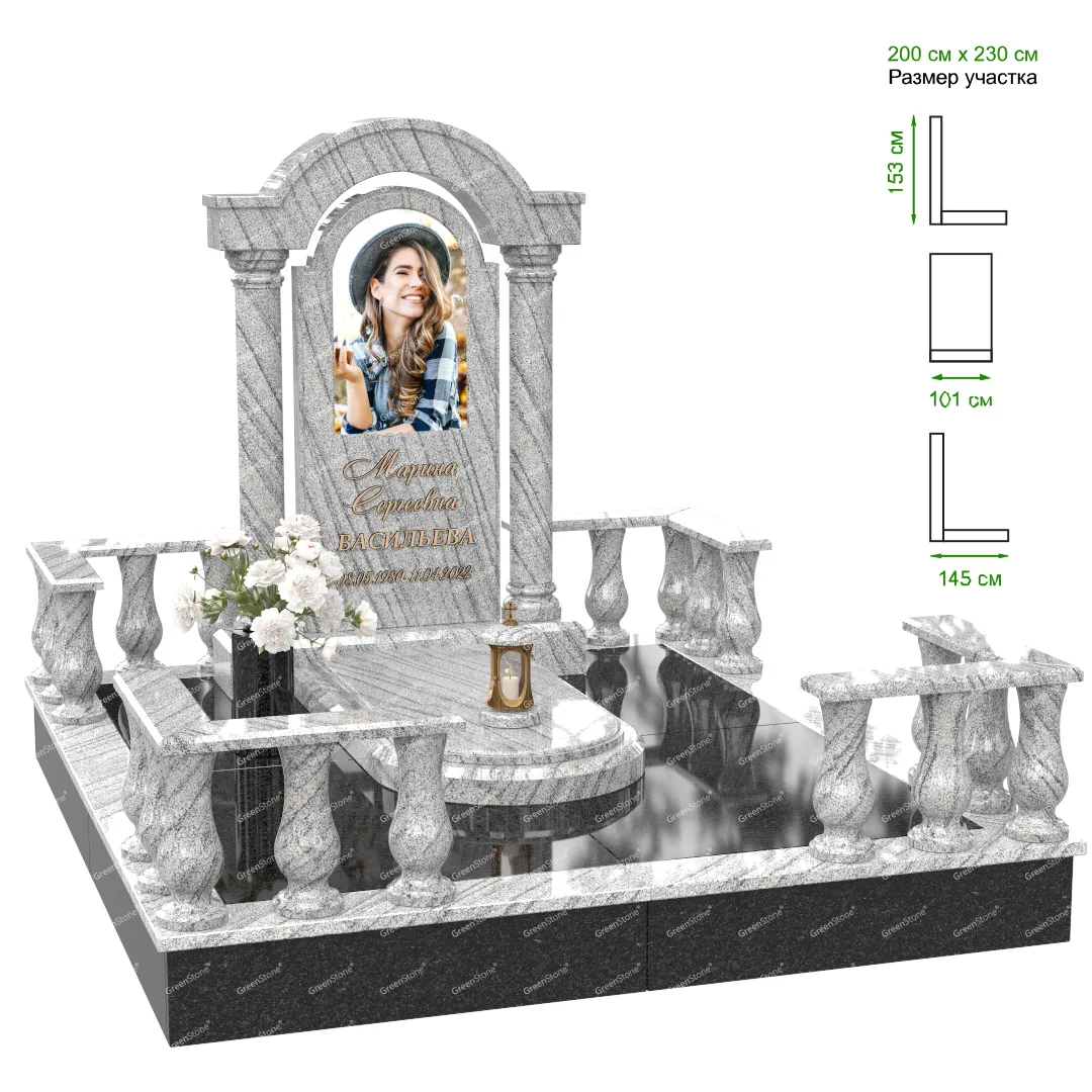 Визуально комплекс отличается от типовой формы не только формой, но и размерами. Массивная стела позволяет дизайнеру реализовать практически любые задумки и пожелания Заказчика, придать готовому изделию солидный вид, раскрыть все достоинства использованного в его изготовлении гранита. Такой габаритный памятник требует профессиональной доставки и установки. Все это также можно заказать в мастерской Грин-Стоун.