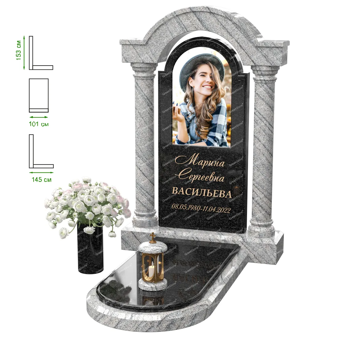 Визуально комплекс отличается от типовой формы не только формой, но и размерами. Массивная стела позволяет дизайнеру реализовать практически любые задумки и пожелания Заказчика, придать готовому изделию солидный вид, раскрыть все достоинства использованного в его изготовлении гранита. Такой габаритный памятник требует профессиональной доставки и установки. Все это также можно заказать в мастерской Грин-Стоун.
