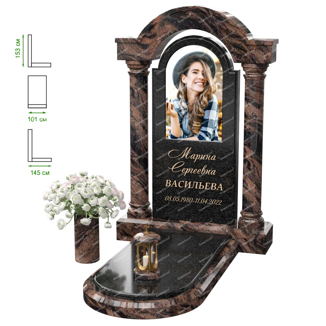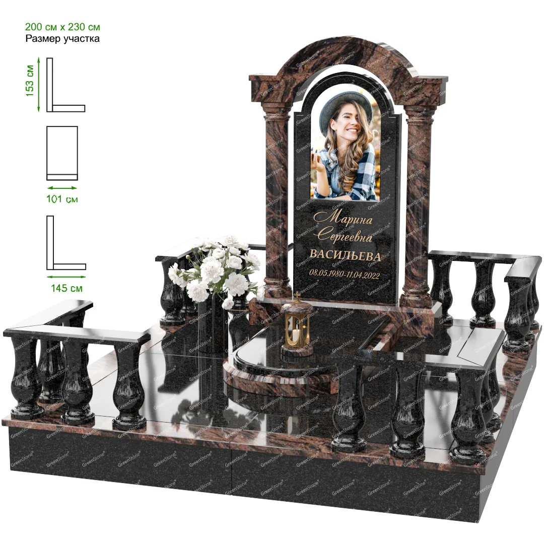 Визуально комплекс отличается от типовой формы не только формой, но и размерами. Массивная стела позволяет дизайнеру реализовать практически любые задумки и пожелания Заказчика, придать готовому изделию солидный вид, раскрыть все достоинства использованного в его изготовлении гранита. Такой габаритный памятник требует профессиональной доставки и установки. Все это также можно заказать в мастерской Грин-Стоун.