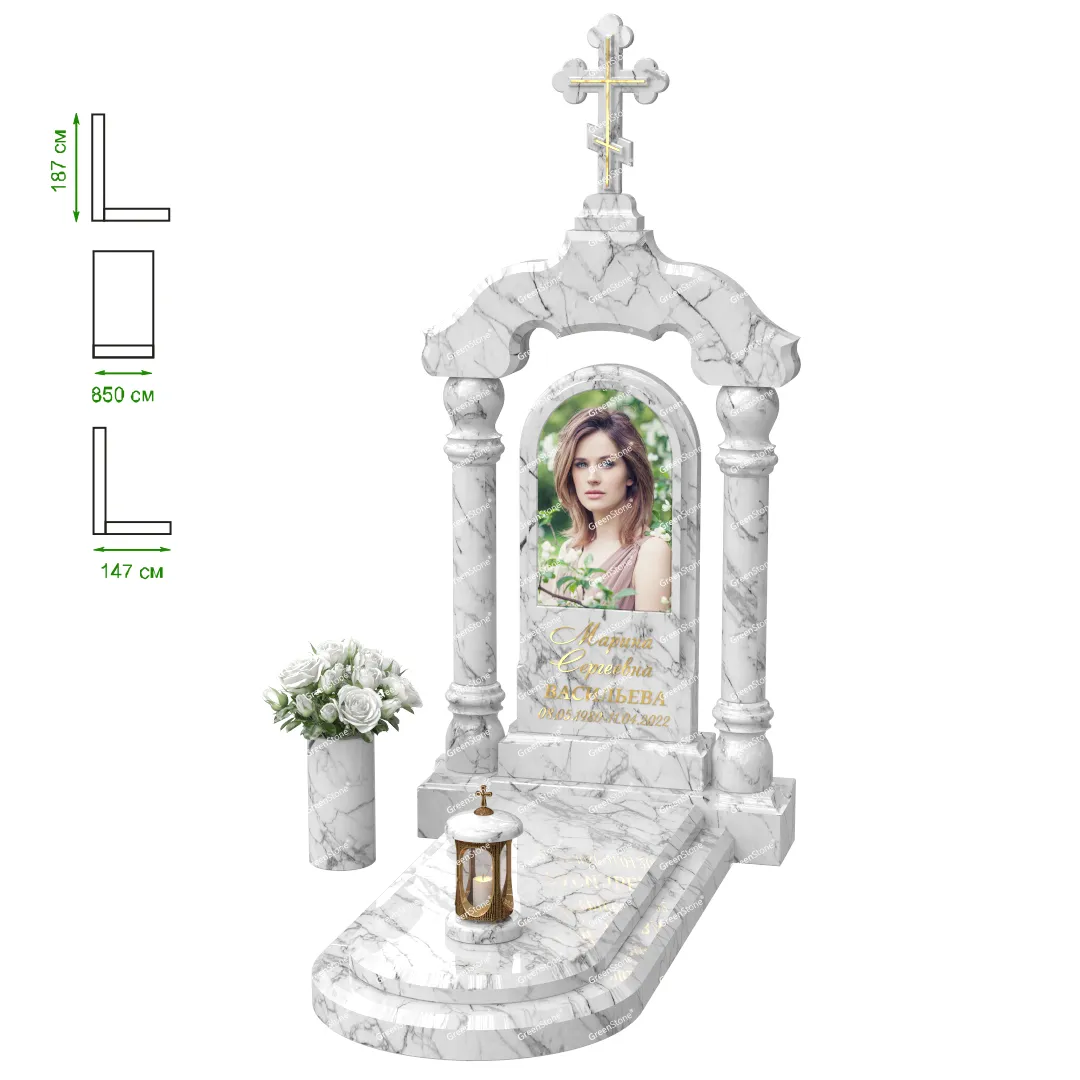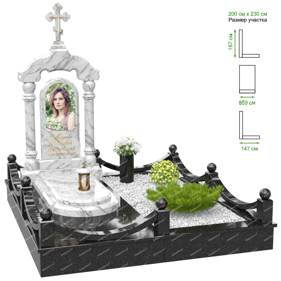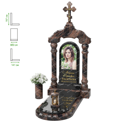 Визуально комплекс отличается от типовой формы не только формой, но и размерами. Массивная стела позволяет дизайнеру реализовать практически любые задумки и пожелания Заказчика, придать готовому изделию солидный вид, раскрыть все достоинства использованного в его изготовлении гранита. Такой габаритный памятник требует профессиональной доставки и установки. Все это также можно заказать в мастерской Грин-Стоун.