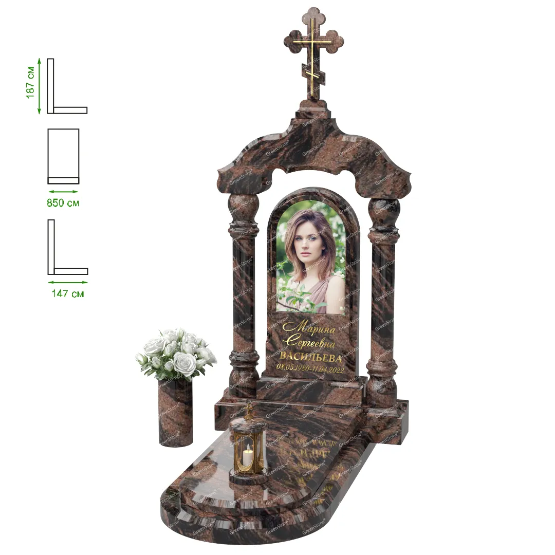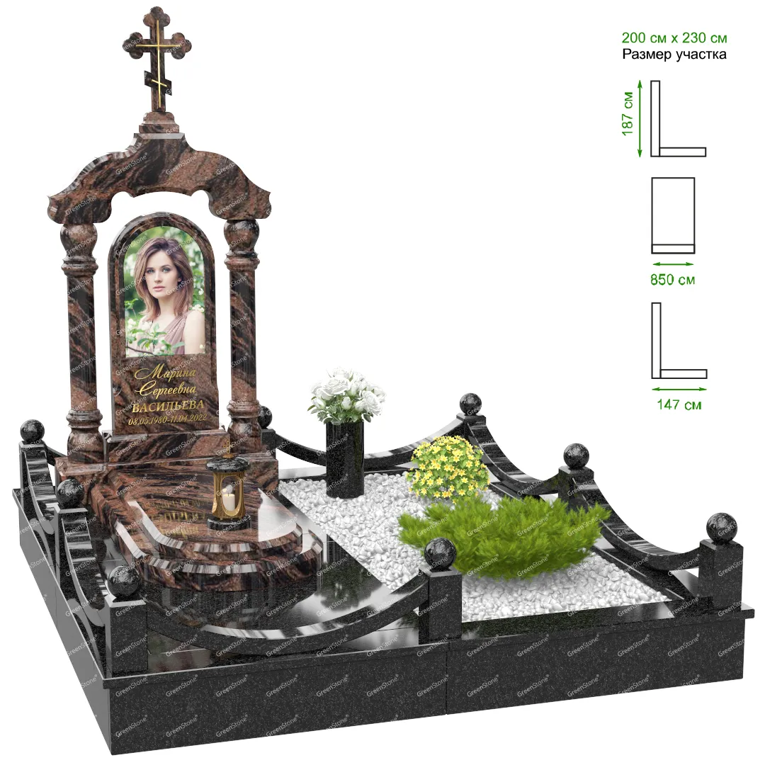 Визуально комплекс отличается от типовой формы не только формой, но и размерами. Массивная стела позволяет дизайнеру реализовать практически любые задумки и пожелания Заказчика, придать готовому изделию солидный вид, раскрыть все достоинства использованного в его изготовлении гранита. Такой габаритный памятник требует профессиональной доставки и установки. Все это также можно заказать в мастерской Грин-Стоун.