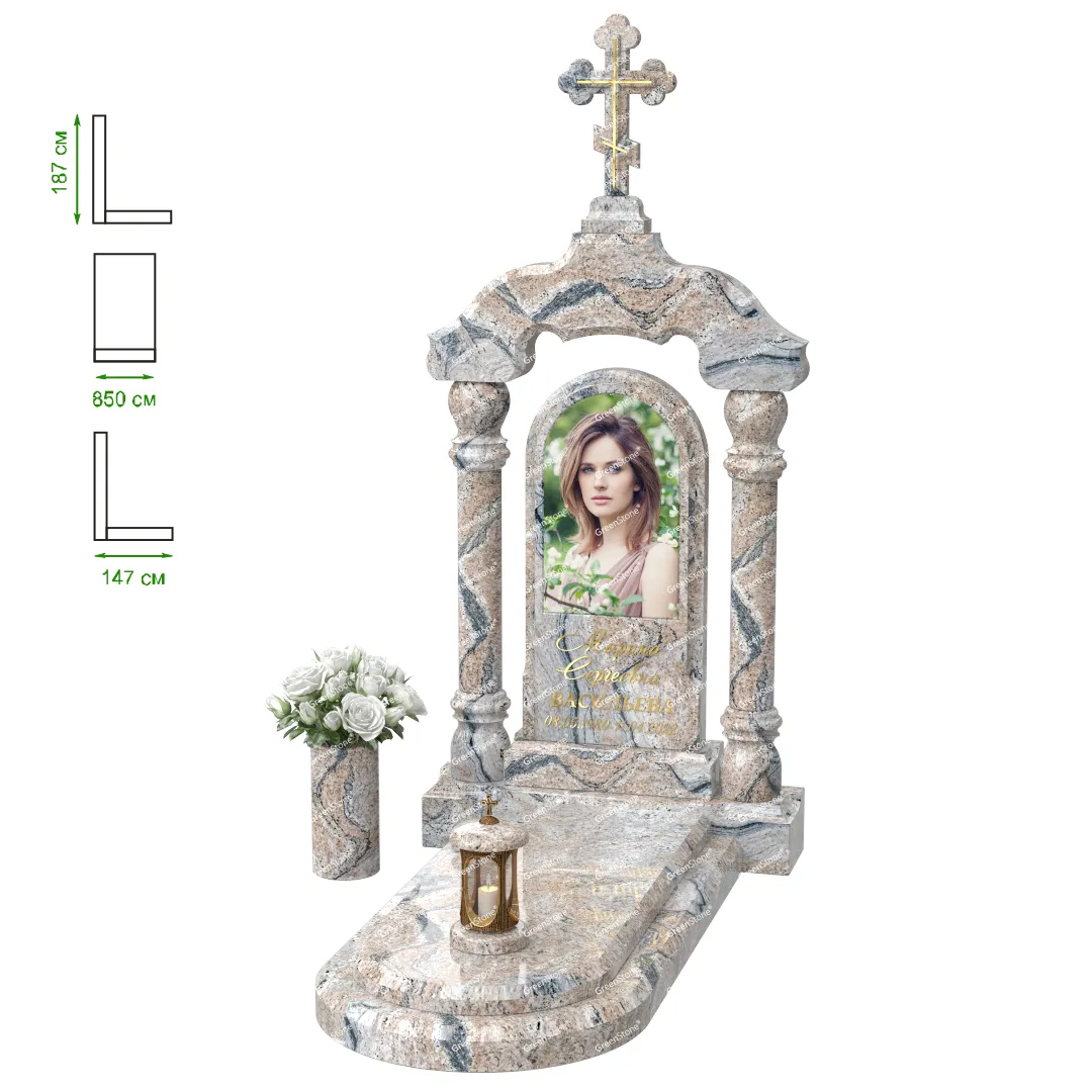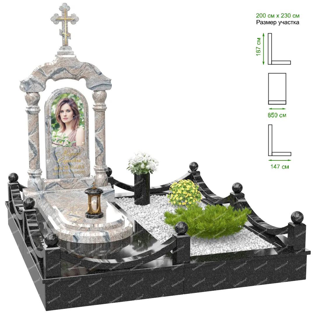 Визуально комплекс отличается от типовой формы не только формой, но и размерами. Массивная стела позволяет дизайнеру реализовать практически любые задумки и пожелания Заказчика, придать готовому изделию солидный вид, раскрыть все достоинства использованного в его изготовлении гранита. Такой габаритный памятник требует профессиональной доставки и установки. Все это также можно заказать в мастерской Грин-Стоун.
