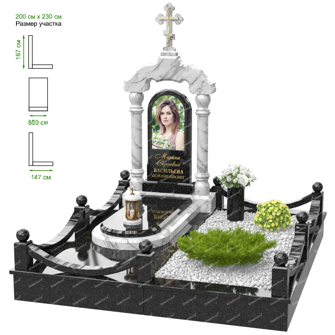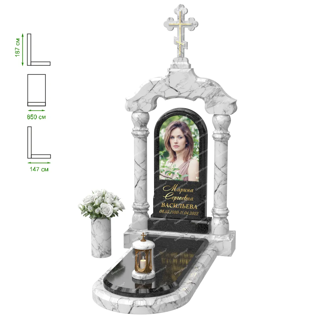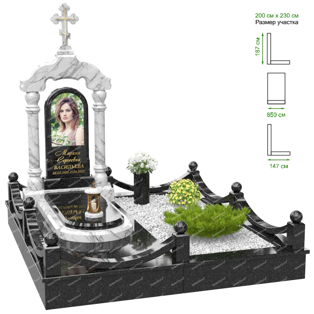 Визуально комплекс отличается от типовой формы не только формой, но и размерами. Массивная стела позволяет дизайнеру реализовать практически любые задумки и пожелания Заказчика, придать готовому изделию солидный вид, раскрыть все достоинства использованного в его изготовлении гранита. Такой габаритный памятник требует профессиональной доставки и установки. Все это также можно заказать в мастерской Грин-Стоун.
