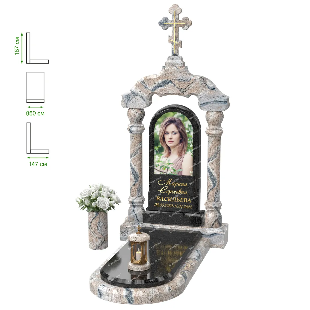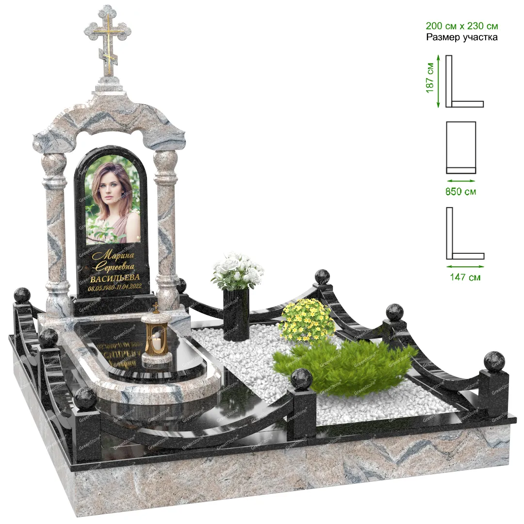 Визуально комплекс отличается от типовой формы не только формой, но и размерами. Массивная стела позволяет дизайнеру реализовать практически любые задумки и пожелания Заказчика, придать готовому изделию солидный вид, раскрыть все достоинства использованного в его изготовлении гранита. Такой габаритный памятник требует профессиональной доставки и установки. Все это также можно заказать в мастерской Грин-Стоун.