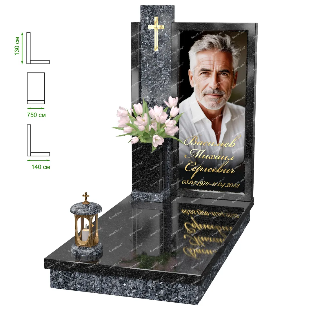 Визуально комплекс отличается от типовой формы не только формой, но и размерами. Массивная стела позволяет дизайнеру реализовать практически любые задумки и пожелания Заказчика, придать готовому изделию солидный вид, раскрыть все достоинства использованного в его изготовлении гранита. Такой габаритный памятник требует профессиональной доставки и установки. Все это также можно заказать в мастерской Грин-Стоун.